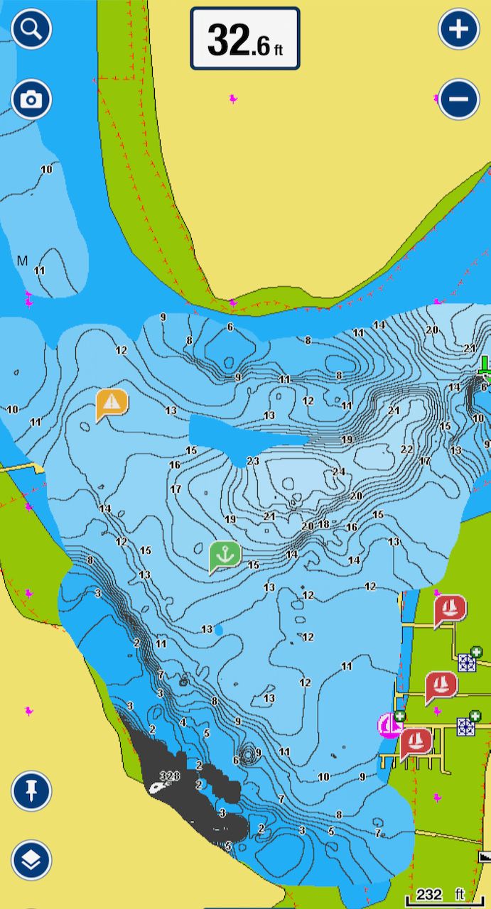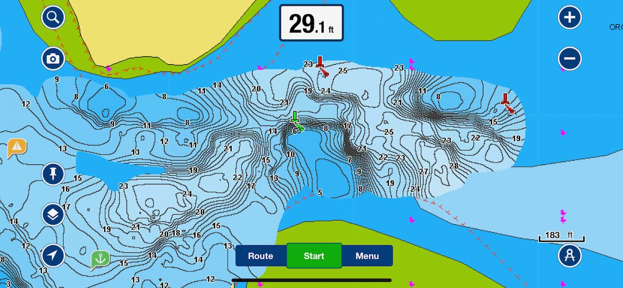 What it does show is that the bottom is quite a bit different than the standard charts for the entrance, with less room near the red "2" buoy, plenty of depth between the other two.