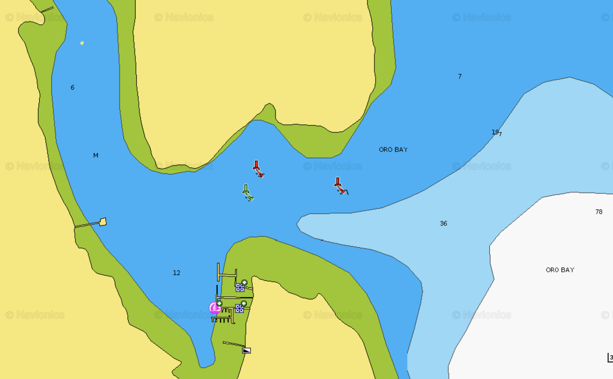 The challenge with Oro Bay is the entrance, which is not that difficult, but can be intimidating if you've never been there before. The charts are also woefully lacking in detail both for the entrance, and the bay itself. What you can see that are important when entering are the three buoys.