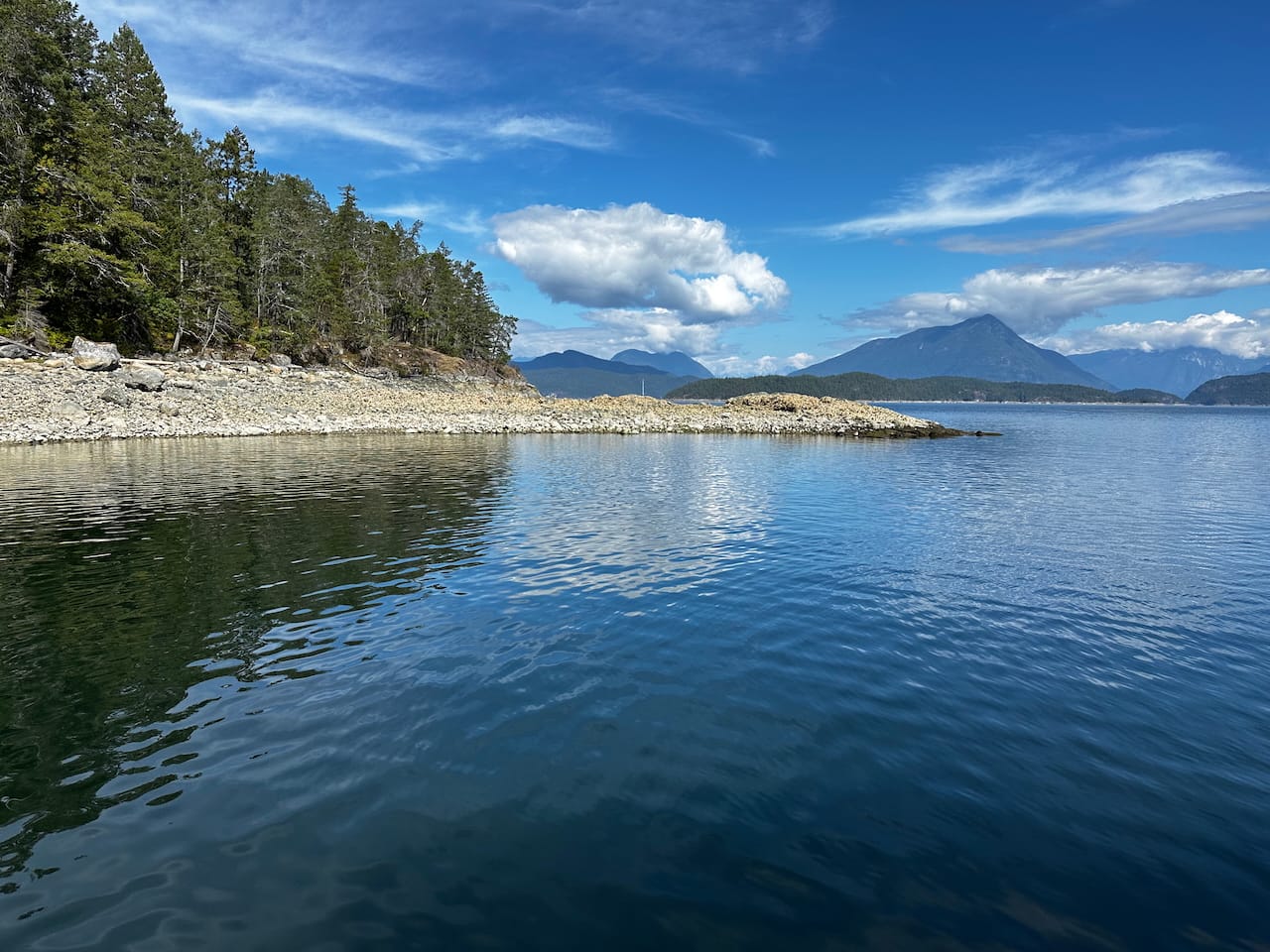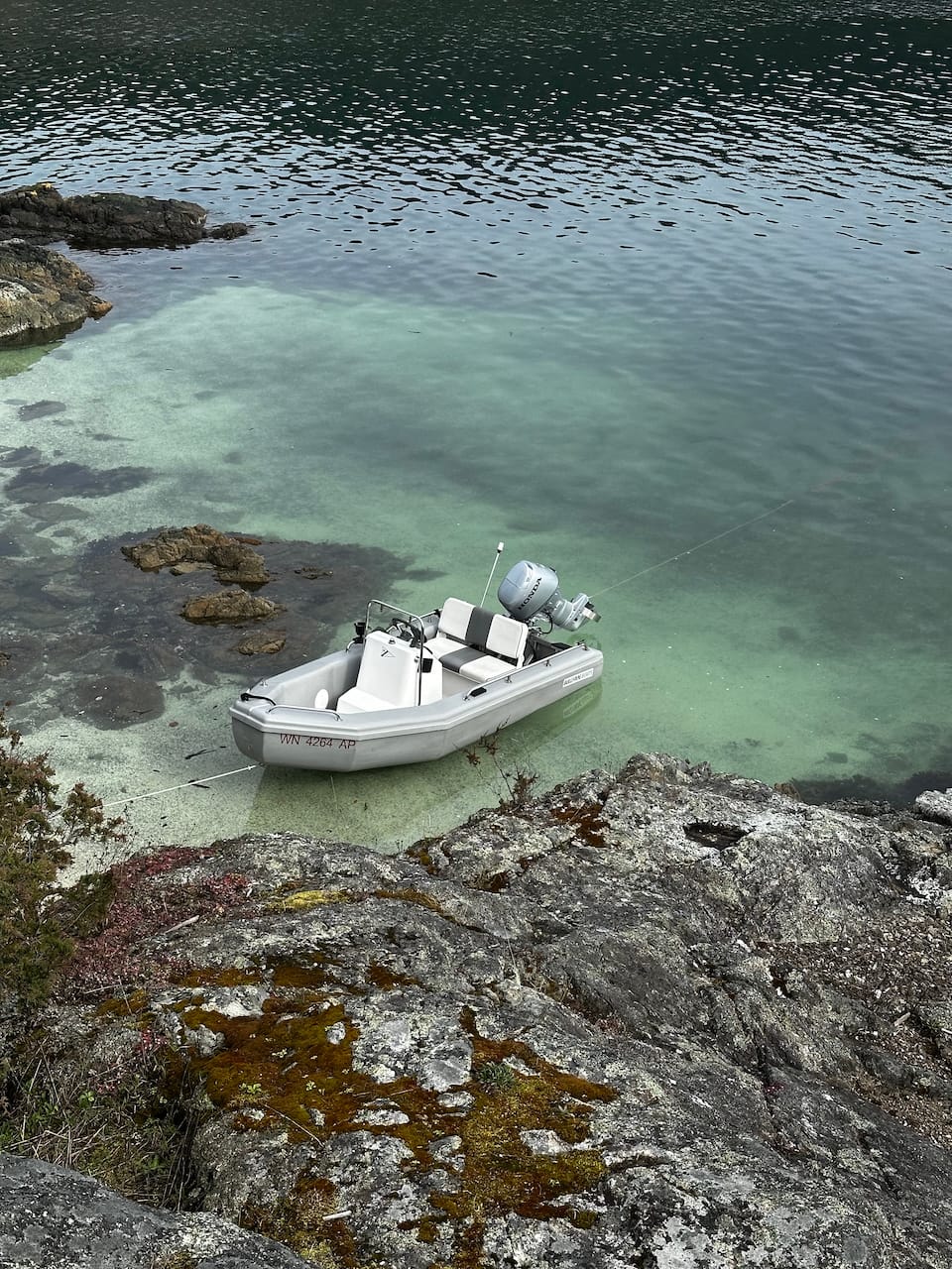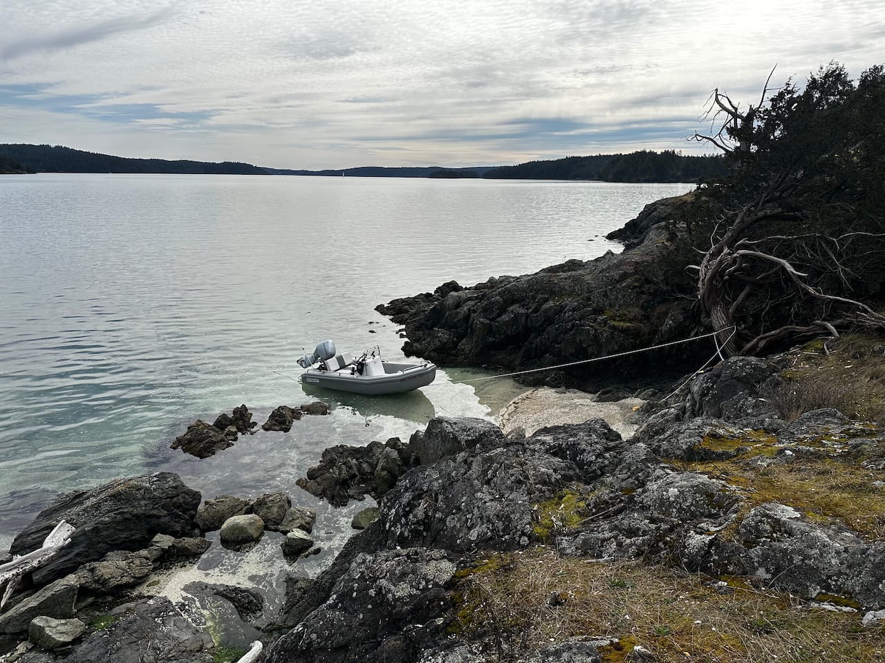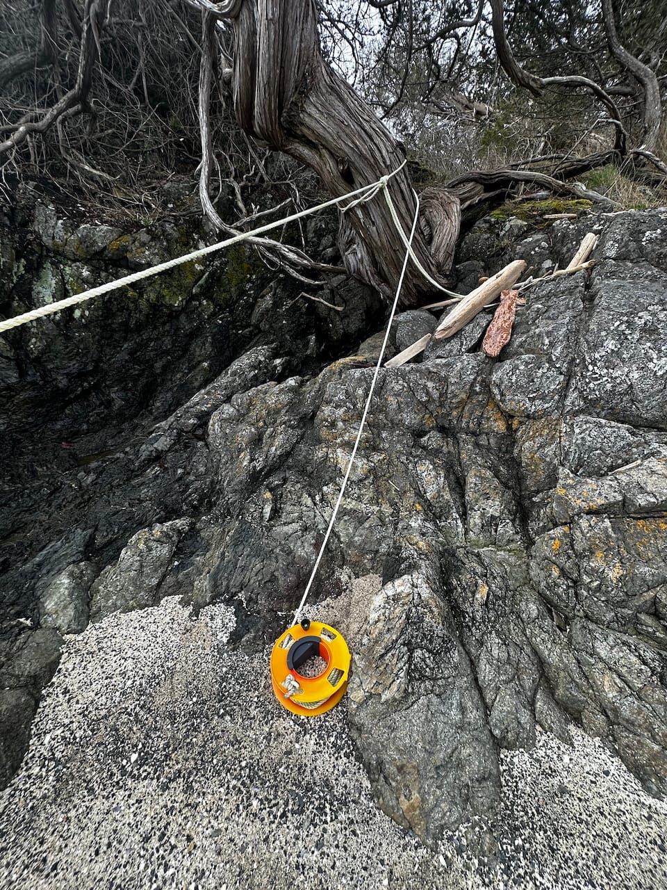Once you have the anchor set and the right stretch and distance, getting out with the reel already attached to the bow eye is the next important step. The dinghy can then float back out on the stretchy anchor line while you secure the shore line to a tree or something else.