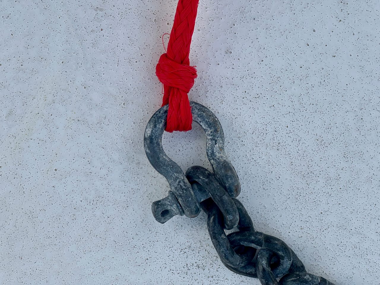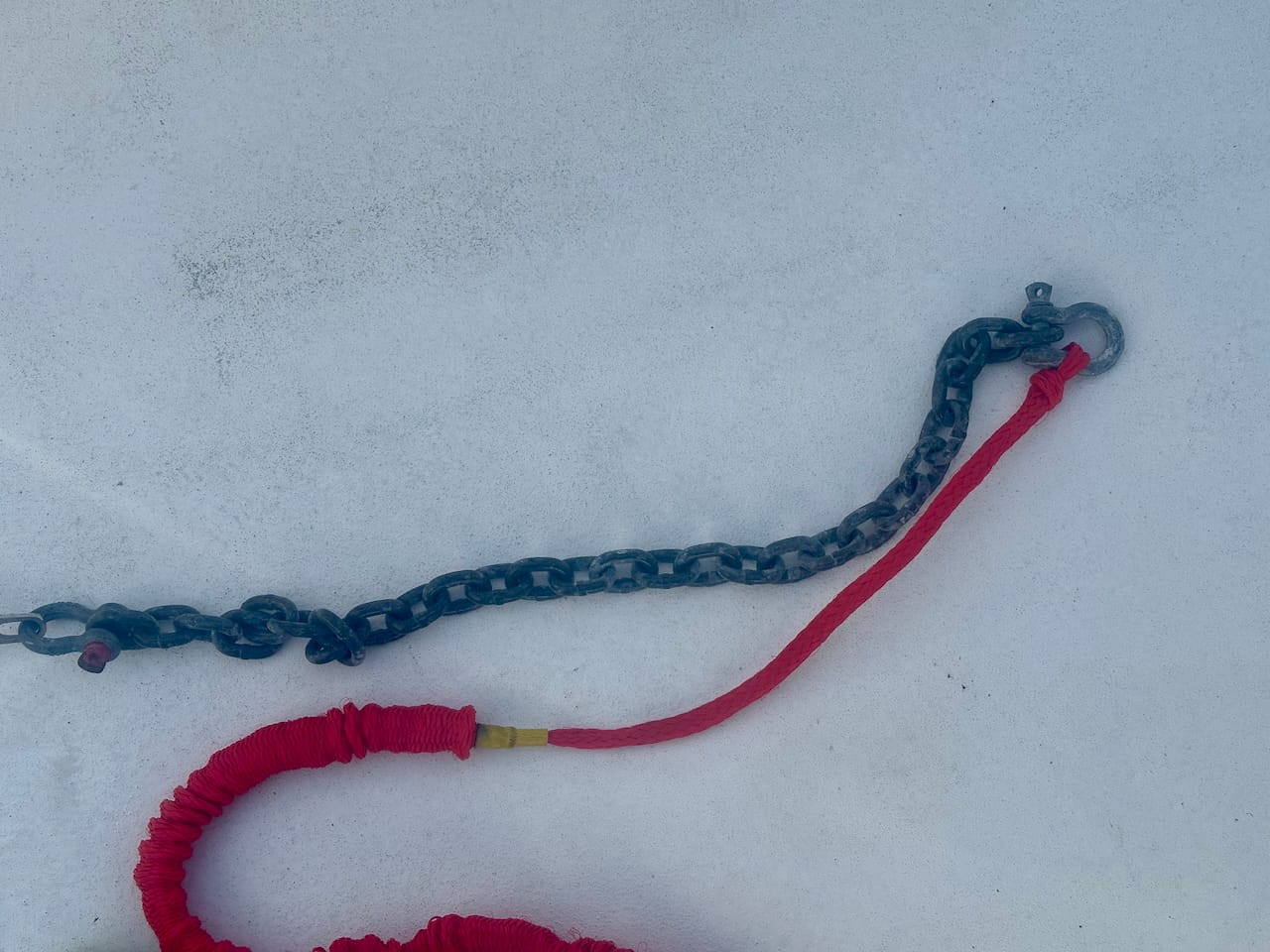 Next, I pair the anchor with a 3' length of chain. This adds some weight near the anchor which allows it to set easier. I randomly tried this a number of years ago when I saw a short section of chain sitting around on my boat from a windlass/chain upgrade. I'm glad I did as the combo of this + better dinghy anchor has meant a very good set every time I deploy the system. My current dinghy is an 11' 6" Bullfrog which weighs about 700 pounds, and I want to make sure it doesn't float away while I'm gone.