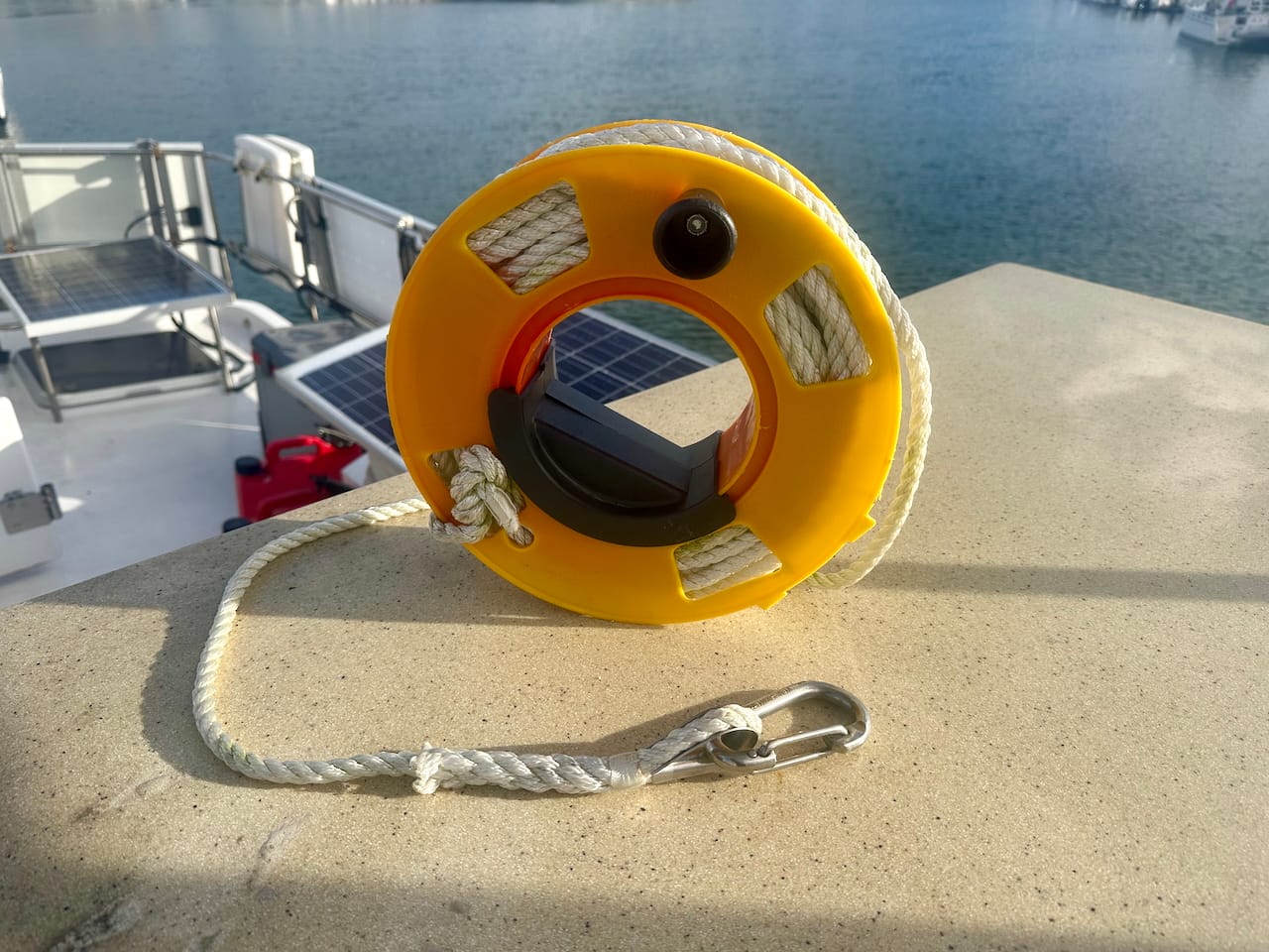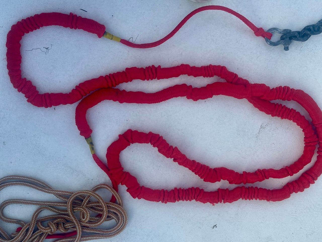 The final pieces in this part of the system is a 20' line added to the end of the Anchor Buddy. This allows me to drop the anchor and stretchy part much further out for more options. This can be helpful on a beach where you end up needing to have the boat float out further while you're gone. You can shorten it as needed depending on the conditions. This is one area where I may improve the setup by switching to floating line both for the floating aspect, but also the color for visibility.