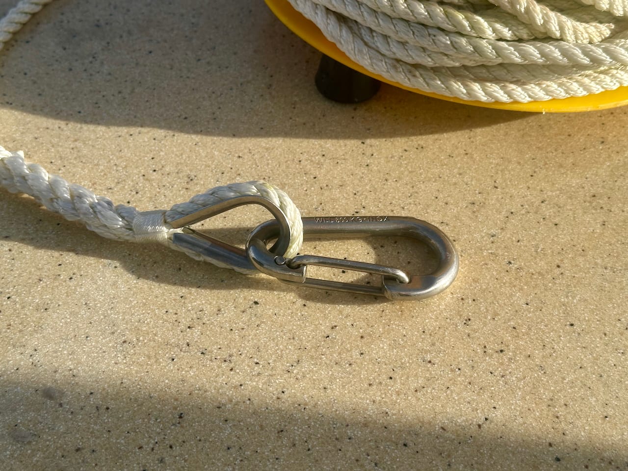 For my setup, I get rid of the shackle and the clip that come with the Anchor Buddy. Neither are quality metal and they will rust within a season. Every single Anchor Buddy I've purchased in the last 10 plus years has done this - I really wish they'd use quality hardware...