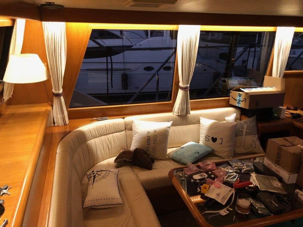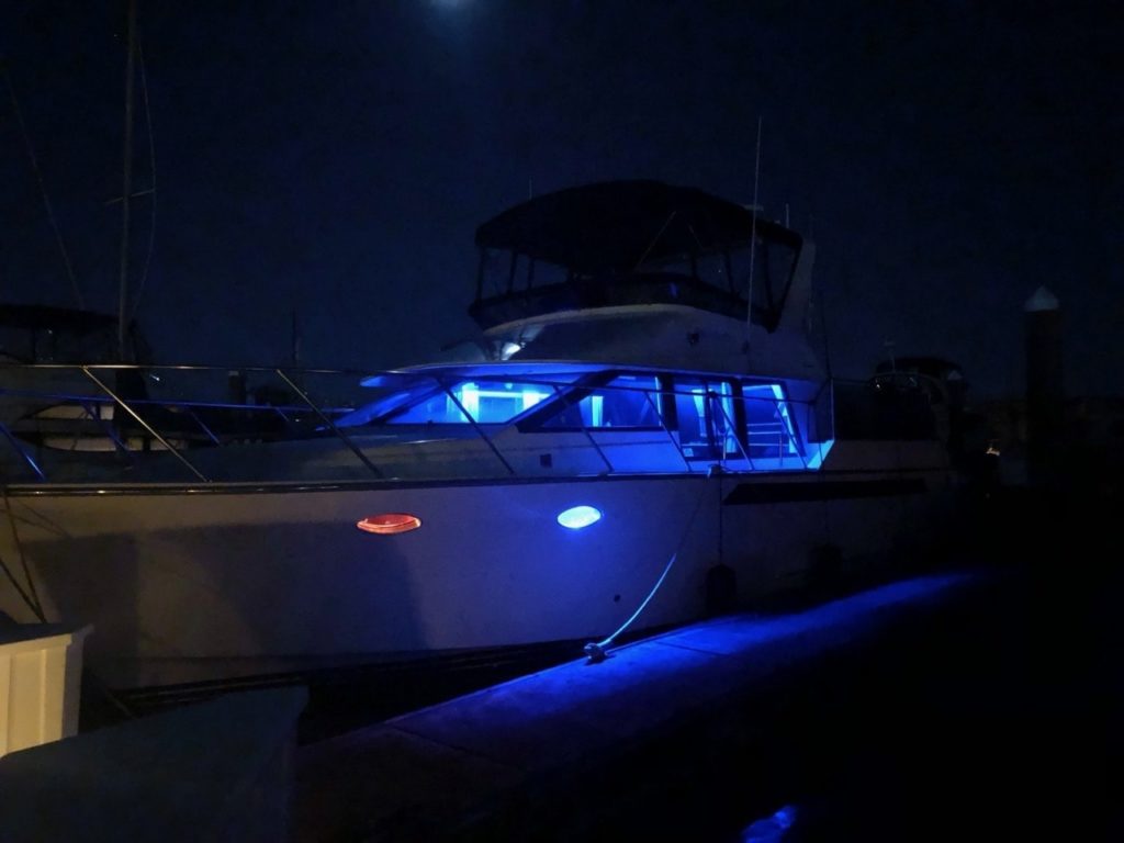 One nice side effect of the lights in the salon being so close to the windows is that they also light up the walkways on the boat, and splash a bit onto the dock! A very quick and relatively inexpensive upgrade that makes the space easier to use and more comfortable in general.