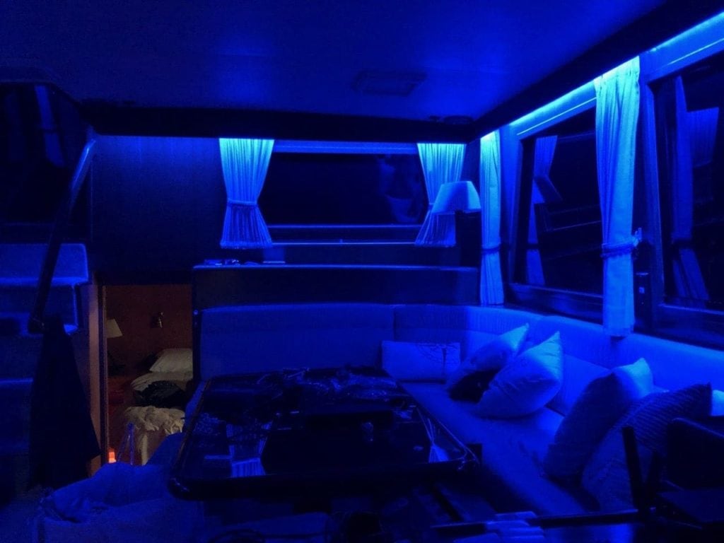 In addition, all around the edge of the salon under the valance where the curtains are was an older system of “courtesy lights” which were essentially a string of red LEDs. The salon itself would draw 5-7 amps just to run those lights! You can see above that I have already replaced them with something new….