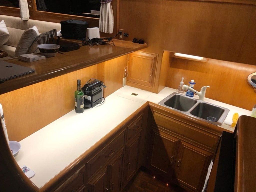 I also used the same system in the galley, which had a couple of compact fluorescent lights providing limited light throughout. Besides the lack of light, I don’t like the amp draw of CFL lights off of DC when away from the dock. The amount of additional light we now have in the kitchen is amazing – several of my crew who end up making most of the meals were extremely happy. No comments about the Jameson bottle next to my coffee machine – if you know boat projects you know why both are there ?