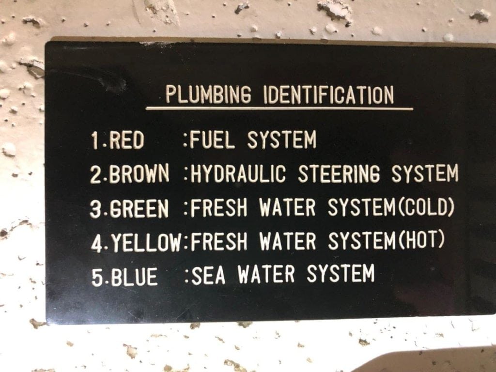 One thing I continue to be impressed with is the little things that Ocean Alexander did when they built Rendezvous. A single bilge system for a lot of the sources of bilge water is one of them, but so is their color coding system for piping, and the clear placard in the engine room in case you forget. For someone who is red/green color blind, I am pretty sure I need to consult other crew members before making changes lest I get things mixed up!