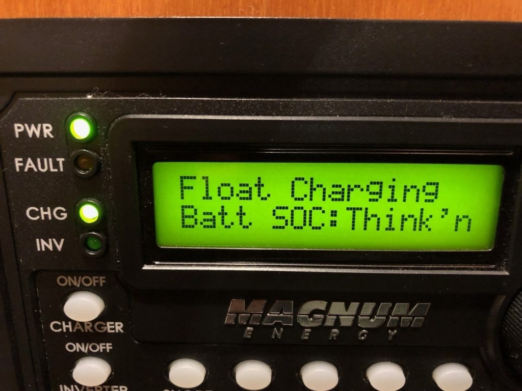 One of the first things I installed was the Magnum Battery Monitoring kit, which I consider critical in any electrical system. I’m surprised at how many boats I’ve visited and worked on that only have an inverter and the basic package that comes with, and no monitoring of the bank itself in terms of state of charge, current flowing in/out, etc. The BMK is a shunt and a device for $175 that will plug into your existing Magnum inverter and add all of that data for you. Mine was still calibrating, as you can see above.
