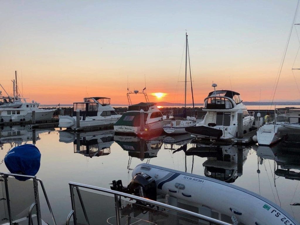 The rest of the evening was uneventful, and we got up super early on Monday morning to avoid the storm due in around noon. After a wet but calm 25 minute crossing, and a couple of docking attempts, we were safe at home.