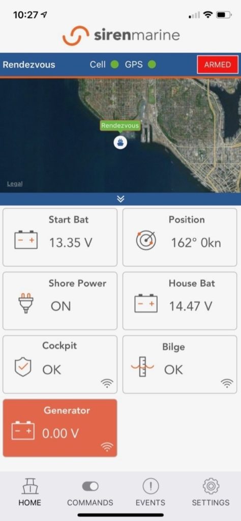 We have had a decent amount of challenges with the 30 AMP 120VAC shore power connection that the boat has – many other boats on my dock of similar size have 50 AMPs – in fact that seems to be the norm. Rendezvous only has 30 AMPs and when you have three 1500W AC heaters on throughout the boat, turning on anything else is not an option. I am considering upgrading to 50 AMPs in the future, but for now, Siren is monitoring things both while I am aboard and away, which with a new boat and lots of unknowns, is very comforting. Their remote wireless sensors are still being fine tuned, hence the red generator icon.