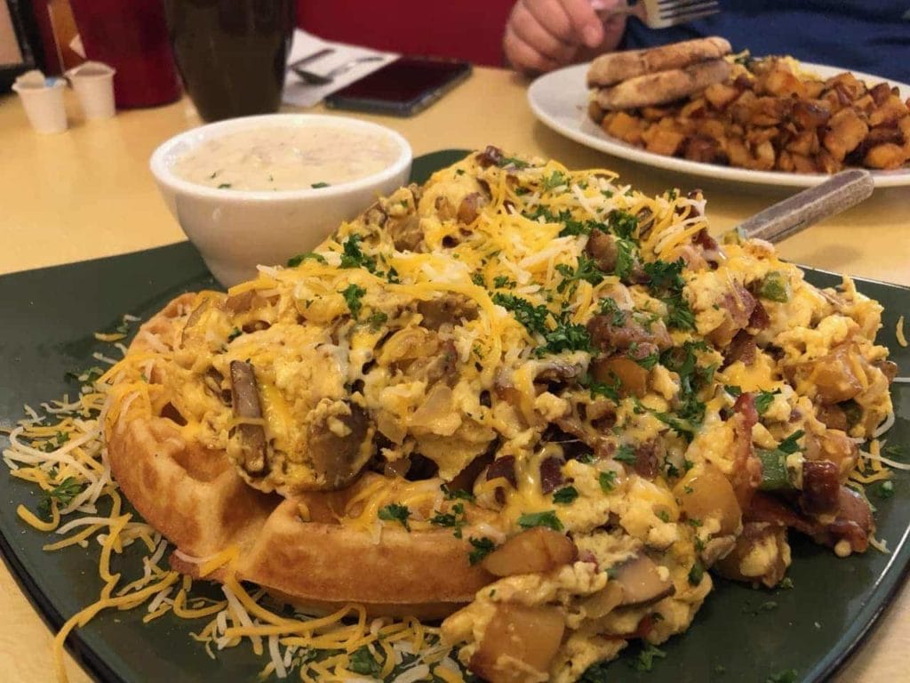 The next morning we dinghied in to the marina dock and found breakfast at the Green Light Diner. I got some crazy huge breakfast dish called the Kon-Tiki Traveler which is “A hearty scramble of eggs, red potatoes, peppers, onions, mushrooms, bacon, SPAM, sausage and cheddar, served on a Belgian waffle with a side of country gravy.” It was really good, but I probably should not have eaten as much as I did.