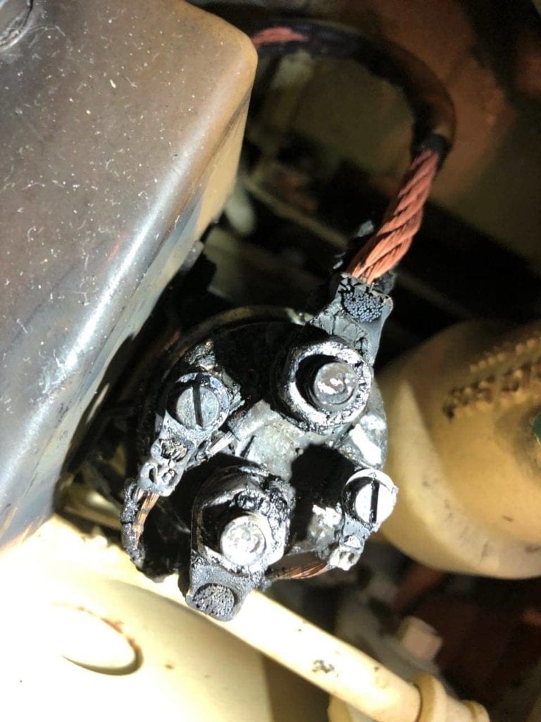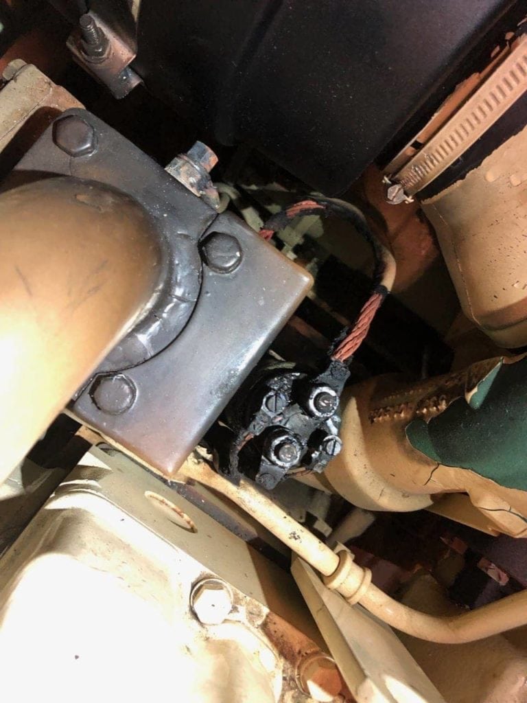 After shutting off all battery power to both engines and removing the floor panels, it was clear where the smoke and burning smell was coming from. What you see above is a solenoid responsible for turning on an element in the airflow of the engine, commonly called a preheating system. The positive wire (bottom large wire) and negative wire are both missing their protective hide for 6-8″ and the positive wire is touching the engine block, which likely caused the short that tripped the main breaker for the engine controls.