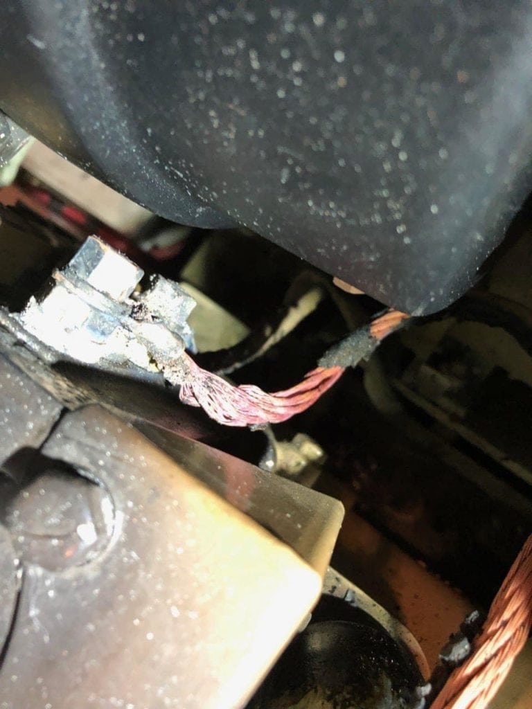 I went to the lower salon driving station, and it was similar there – no engine instruments, and no control of the state of the engine other than throttle and gear. I couldn’t turn the port engine off. I went into the engine room and there was lots of burning smell and a light smoke. After about 2 minutes of inspecting the port engine, which was still running by itself, I found a negative wire going from the starter up into the engine that had lost most of its sheathing, and clearly looked burned. I could see other things further up that were burned, but I couldn’t get to them without removing a floor panel above the engine.