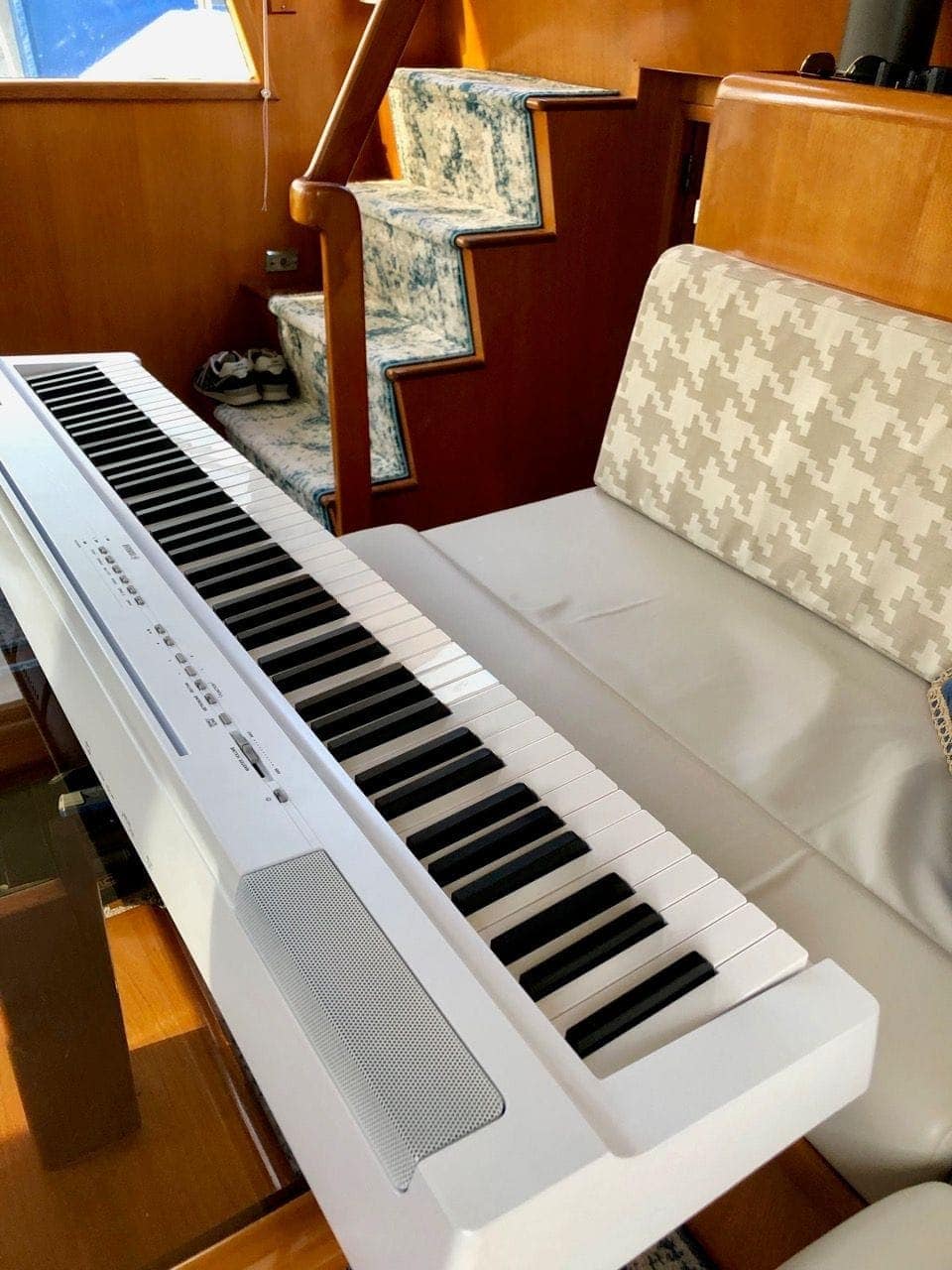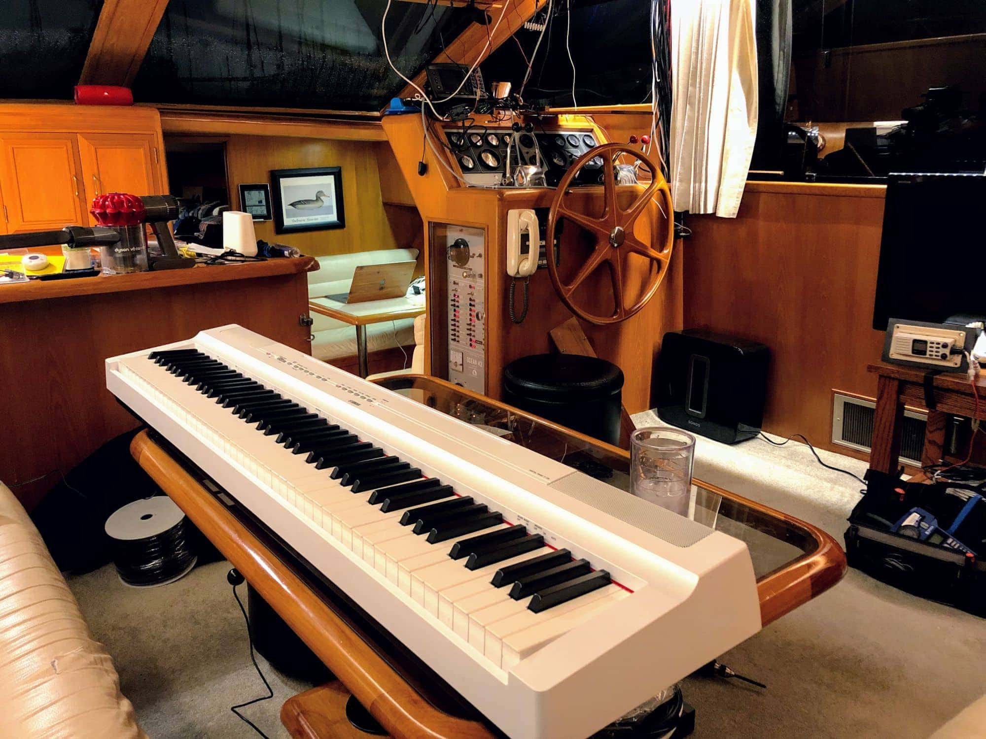 I’m extremely happy that I found a light, quality piano with excellent sounds and great key action to play on the boat. And now, with my simple band setup, I have a secure place to store it when underway, out of the way in a closet, and ready for the next concert night!