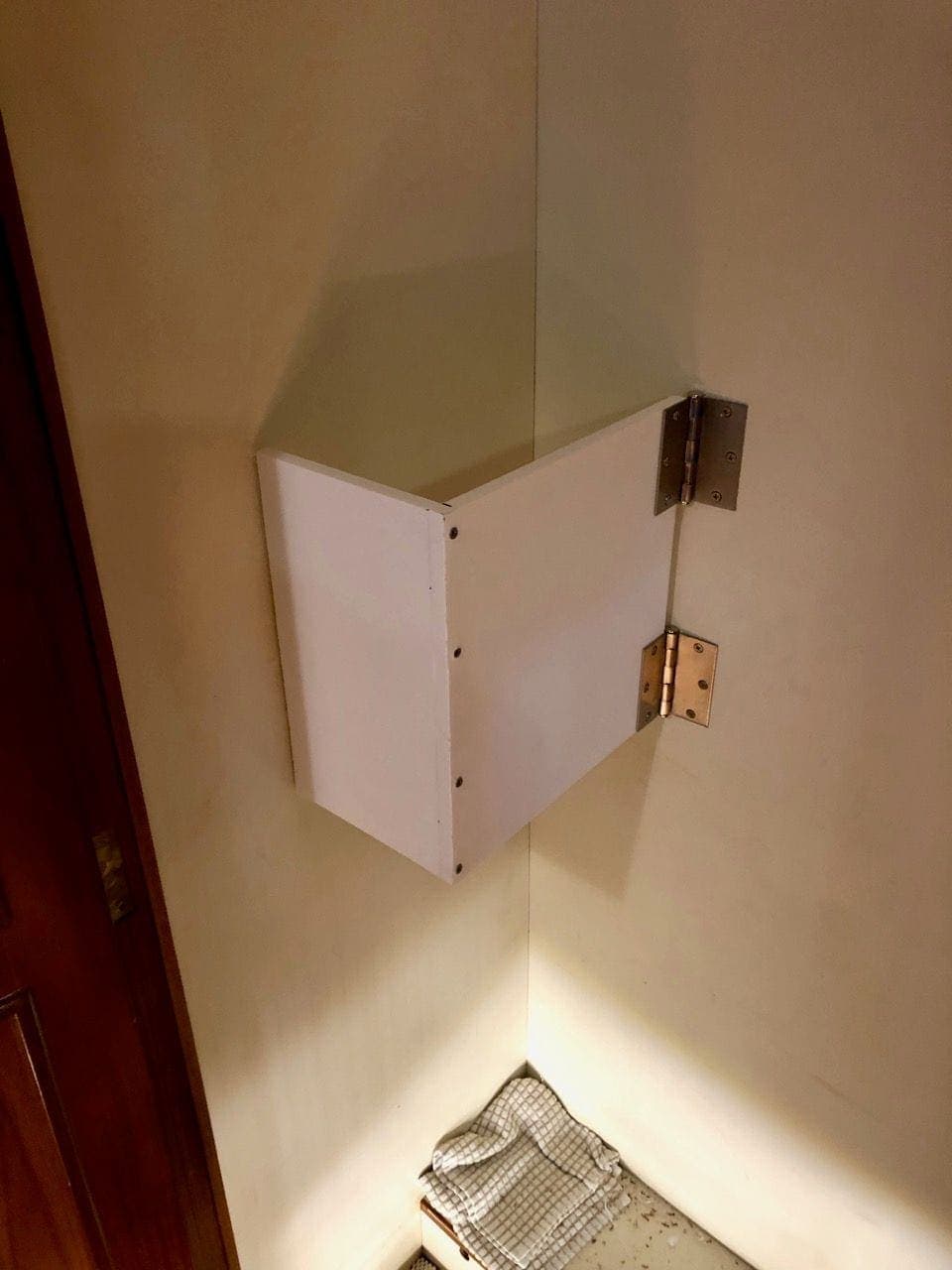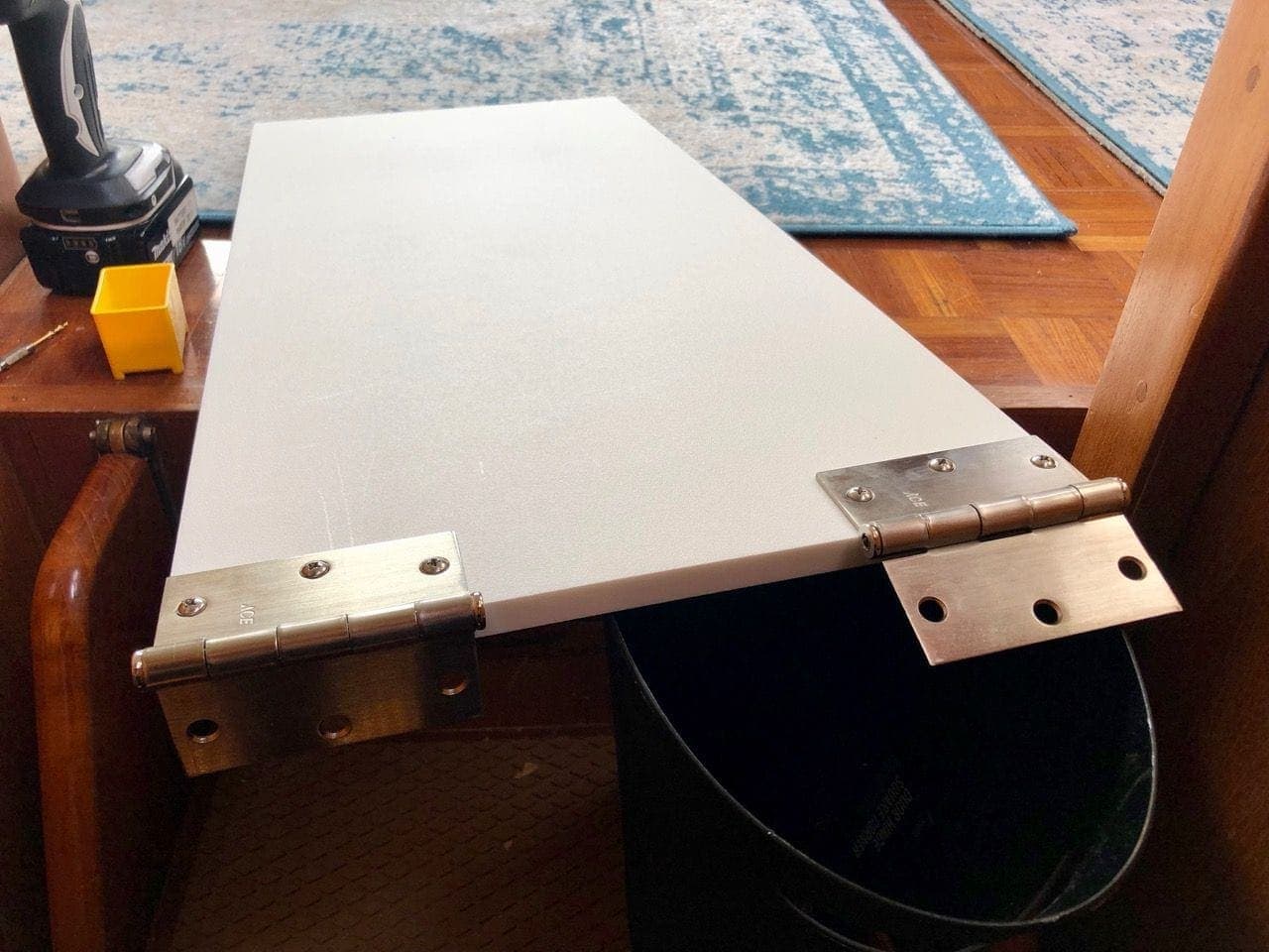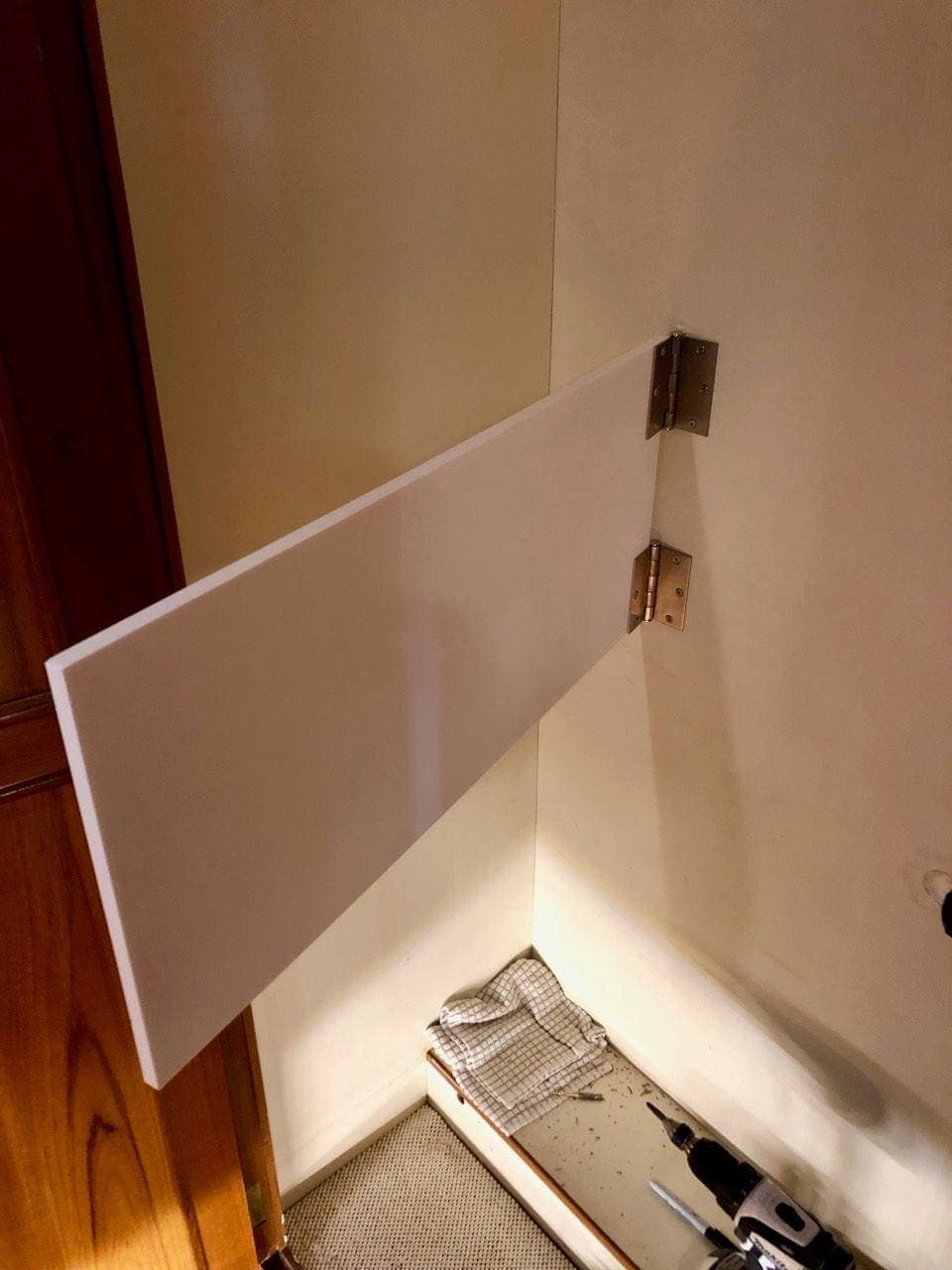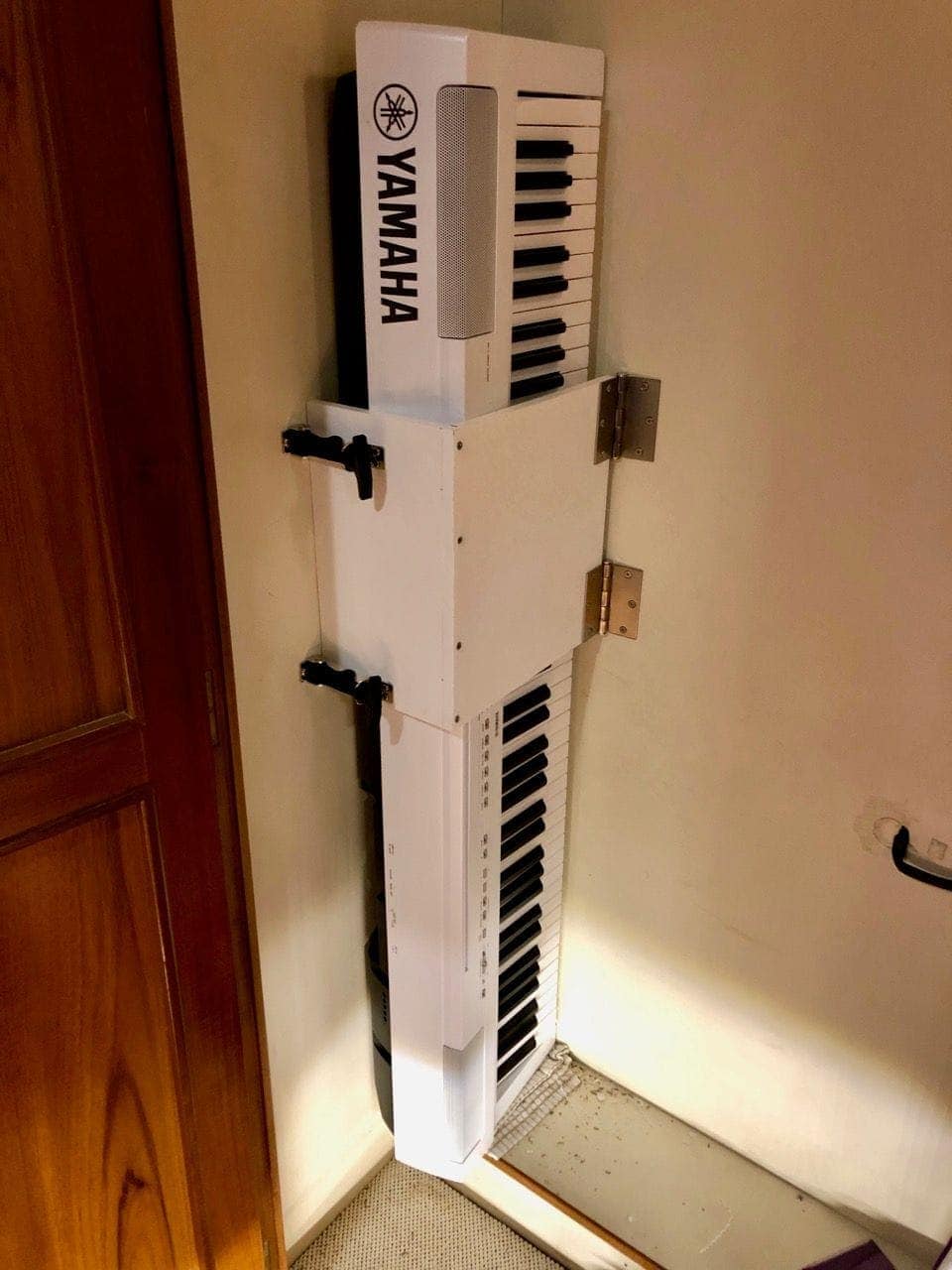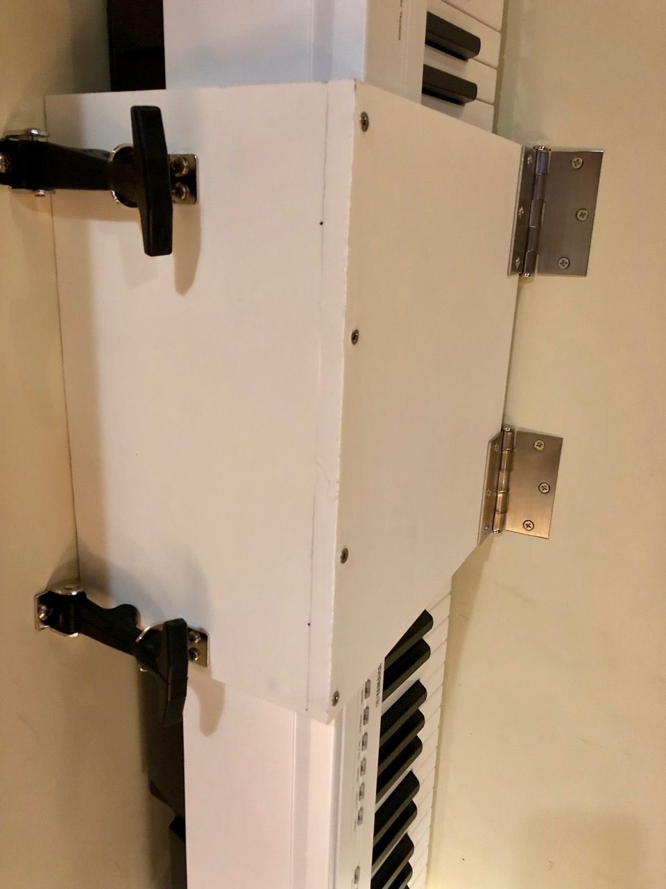 I chose to use 1/2″ Star Board to make a wide band that would go around the middle of the piano while it stood up in the corner of the closet, and kept it stable there. I put a couple of door hinges on the back edge where it would hinge out away from the piano.