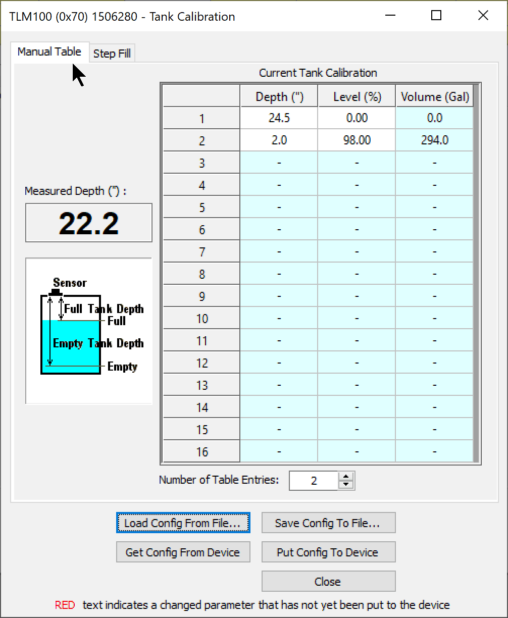 The next step is to calibrate the tank by setting depths and levels. My tank was 24.5″ deep from the face of the sensor to the bottom of the tank. The sensor can’t read anything closer than 2″ to it accurately, so I estimated that would be about 98% full, but I think that might be wrong after seeing that about 2.5″ of diesel (which is what I have in there right now – quite low!) is about 10%, I may need to change that value to 95%.
