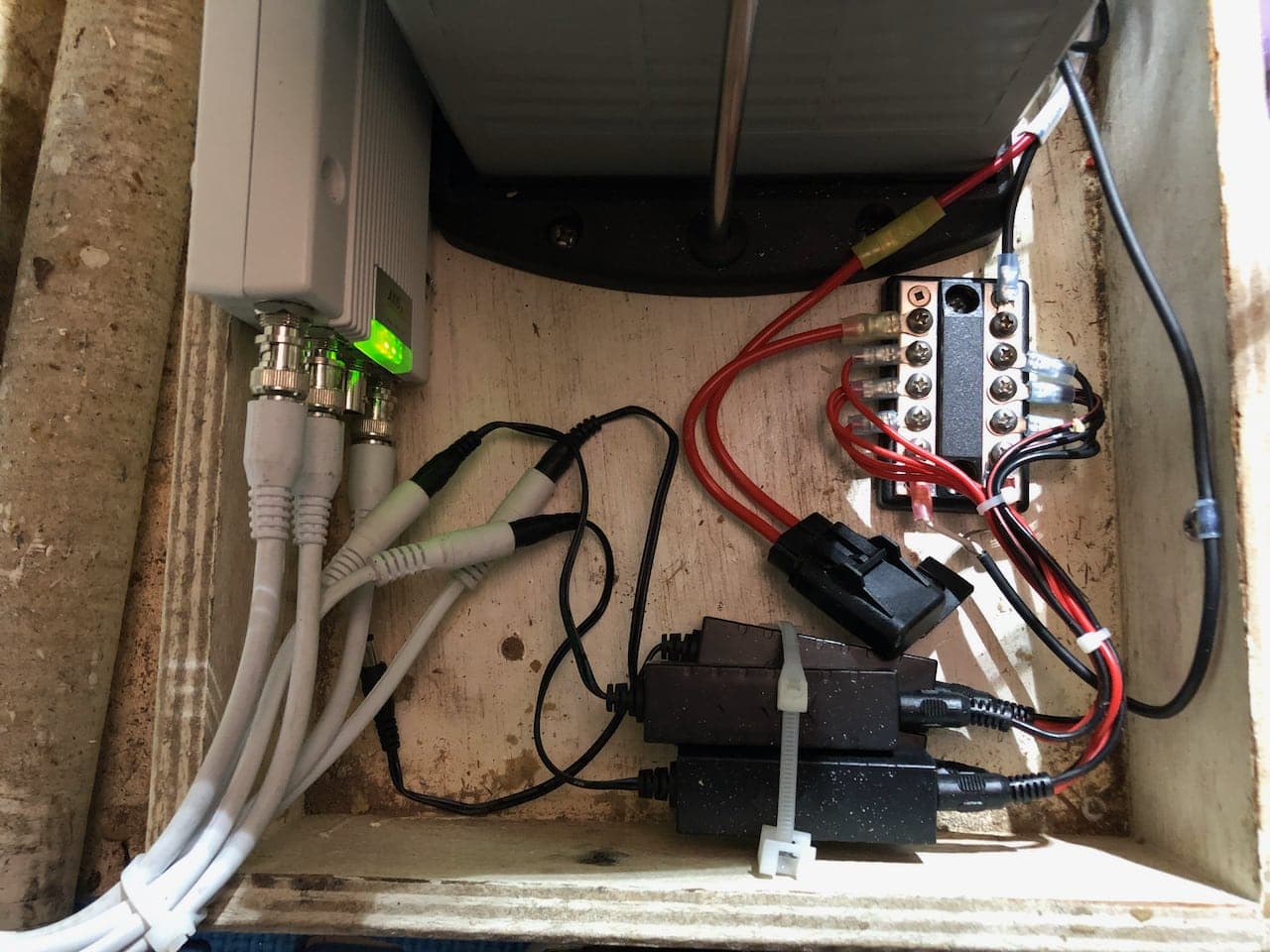 I paired this with some stable 12v DC power supplies that get power off a dedicated circuit for the AXIS and cameras from my main house battery bank, and output a constant 12v DC to the cameras. Based on their specs, I probably could have wired them into the battery bank directly without a voltage stabilizer, but I was being a bit more careful and wanted some longevity out of the cameras.