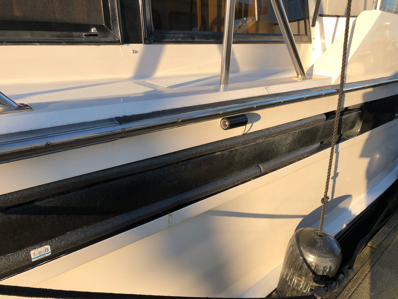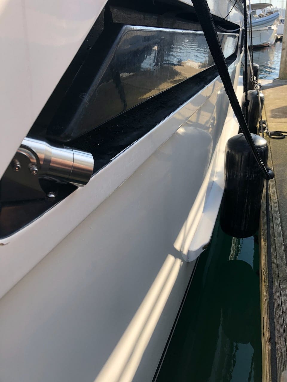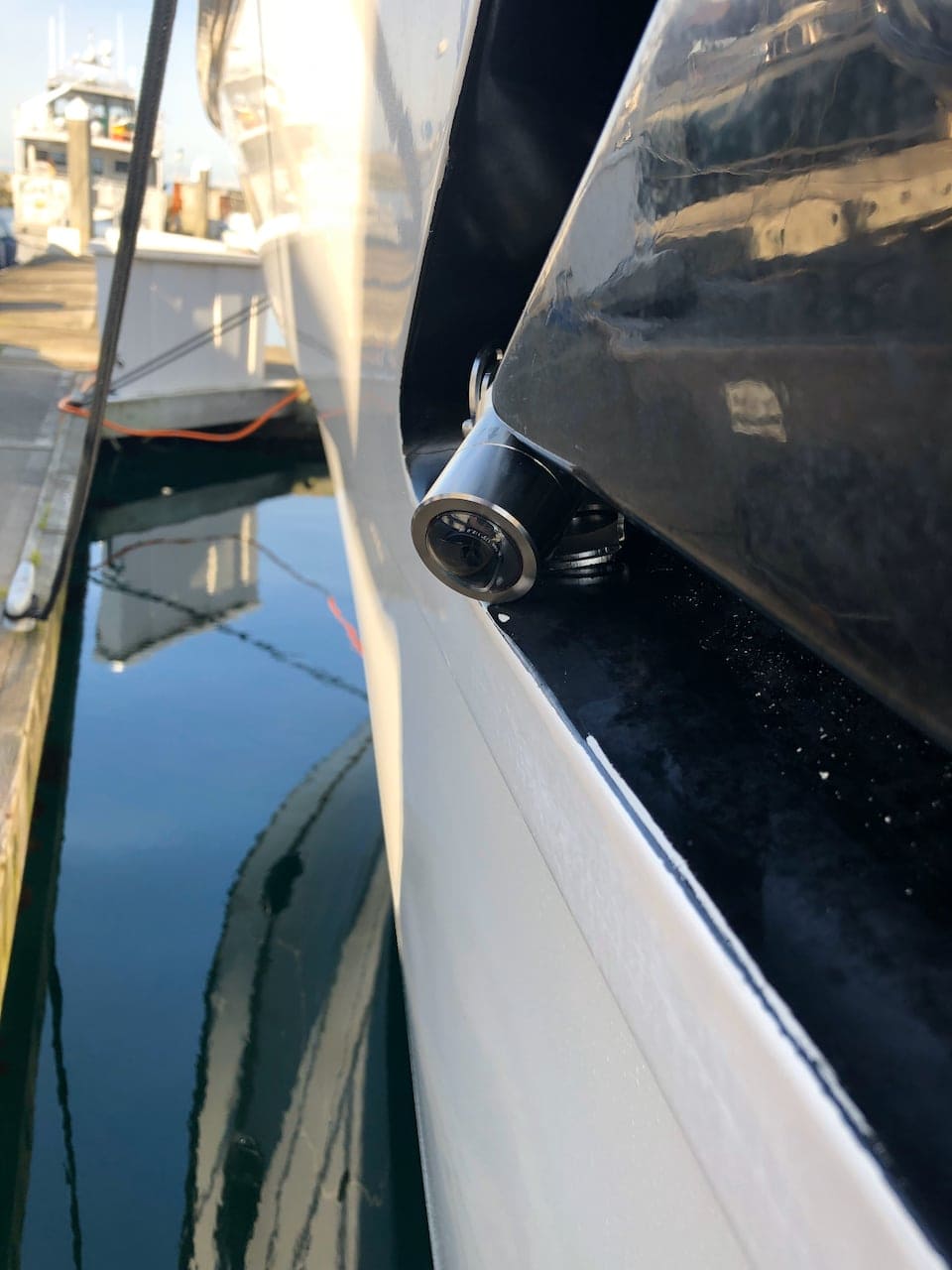 I tried moving one further down, right on the engine intake, and used a super secure zip tie mounting system. It did give me a slightly better view, but still not enough of the edge of the dock. And this configuration was asking for a problem – check out the fender line and how it would happily get caught up in the camera and rip it off or mess it up.