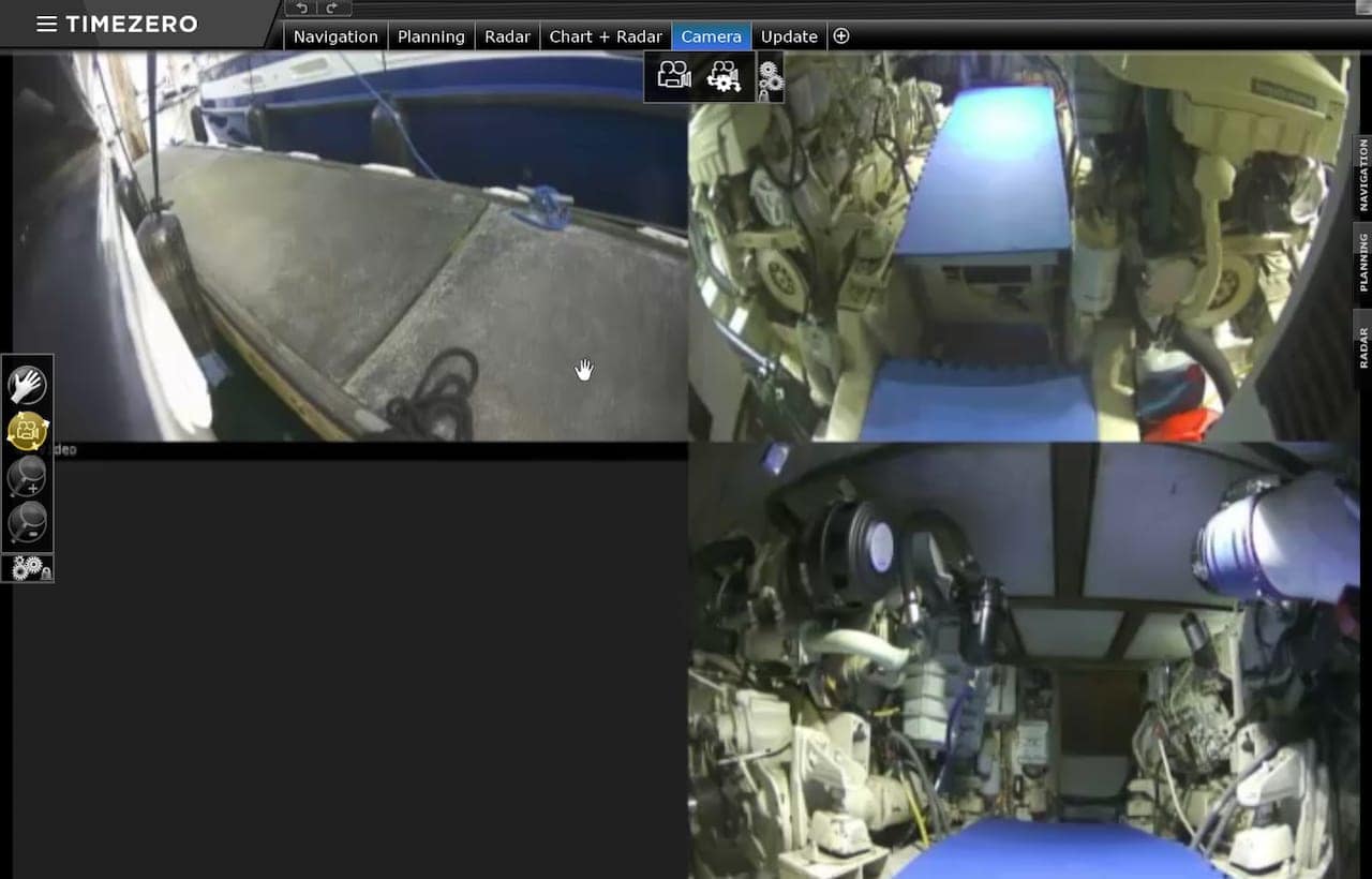 With the quad AXIS server, I can configure a number of different layouts including a quad view, which is sometimes useful both on the PC as shown here in TimeZero, in Coastal Explorer, or on the MFDs so I can see the dock and engine rooms all at once.