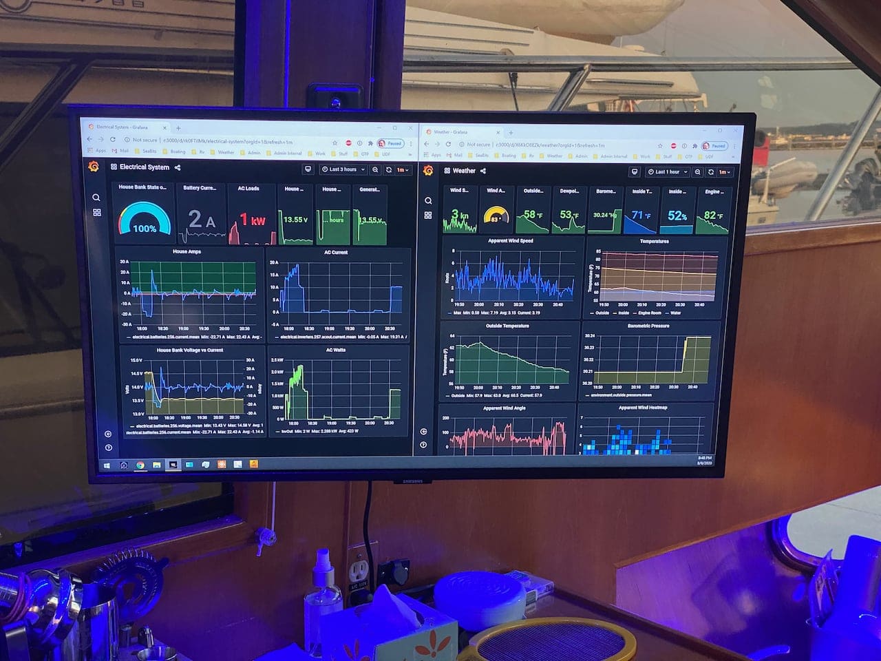 I have the weather and electrical dashboards up while I am at anchor almost all the time. They usually appear on the 22″ touch screen monitor in the salon, but I also Miracast them to a TV sometimes so I can have a bigger canvas, or have them displayed on a USB-C remote monitor up on the flybridge.