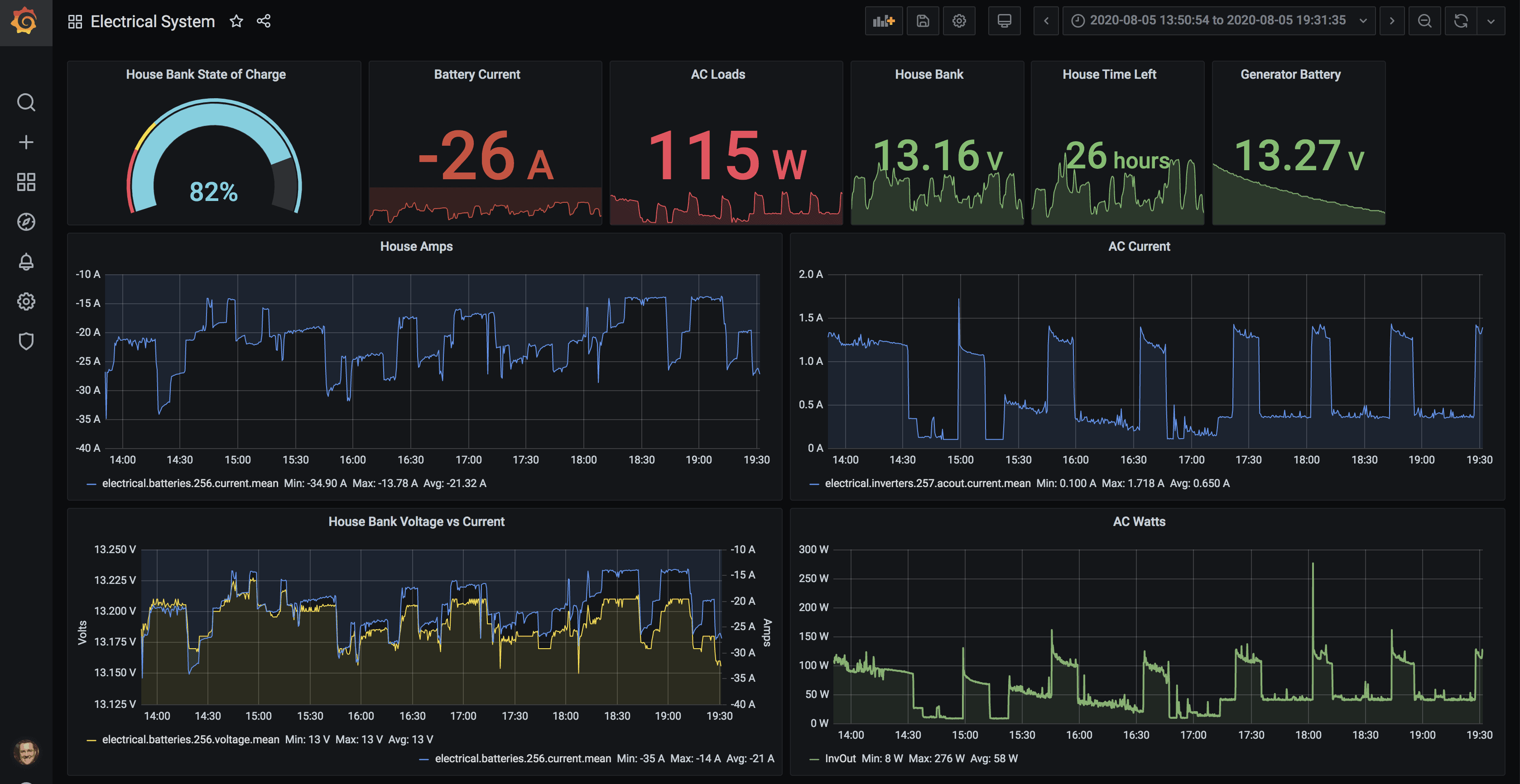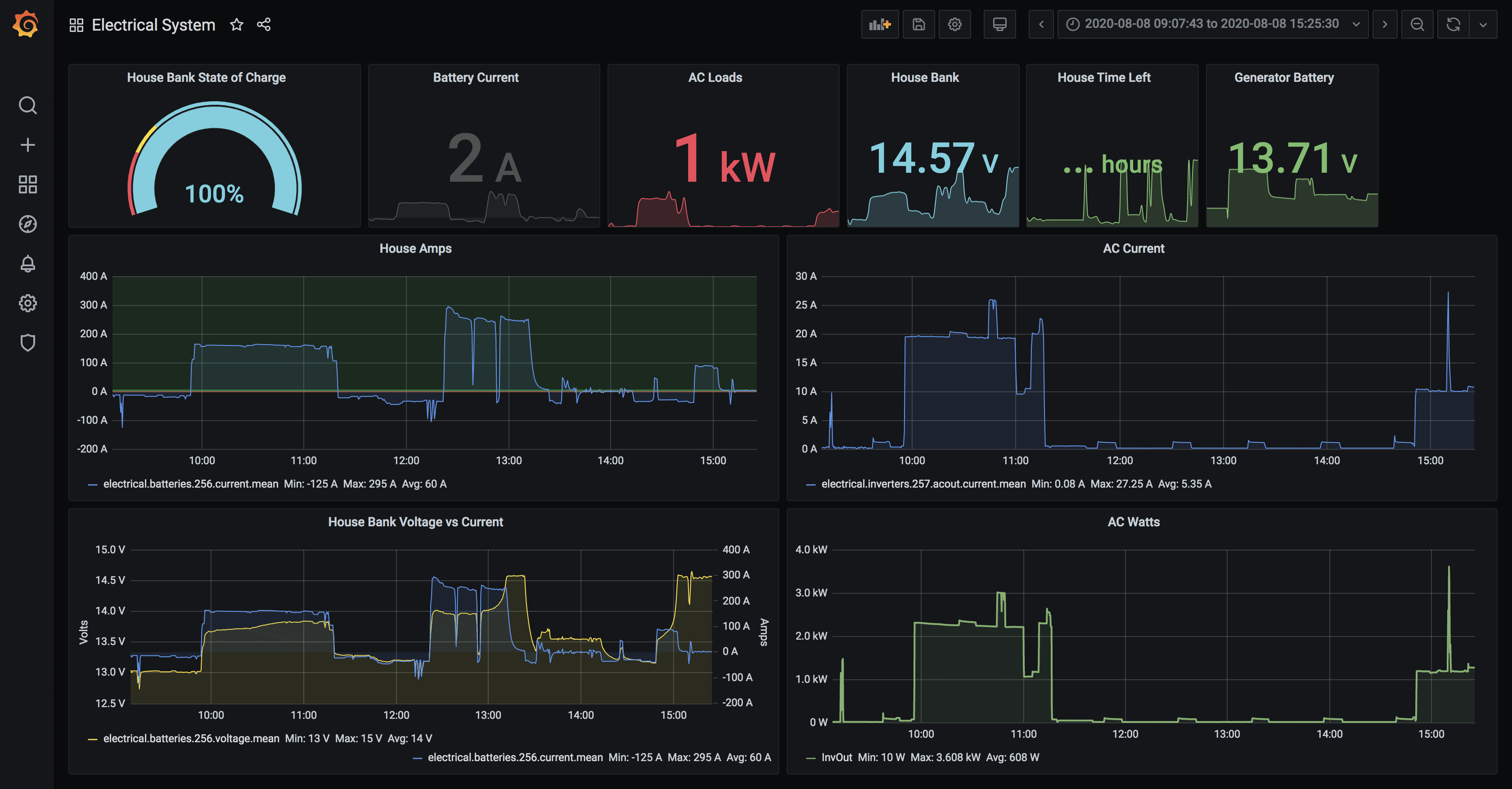 This dashboard is similar in layout to the weather one – the top contains real time squares showing State of Charge, the battery current as measured by the shunt, AC loads on the inverter, the house bank voltage, time left on the house bank (estimated), and generator bank voltage.