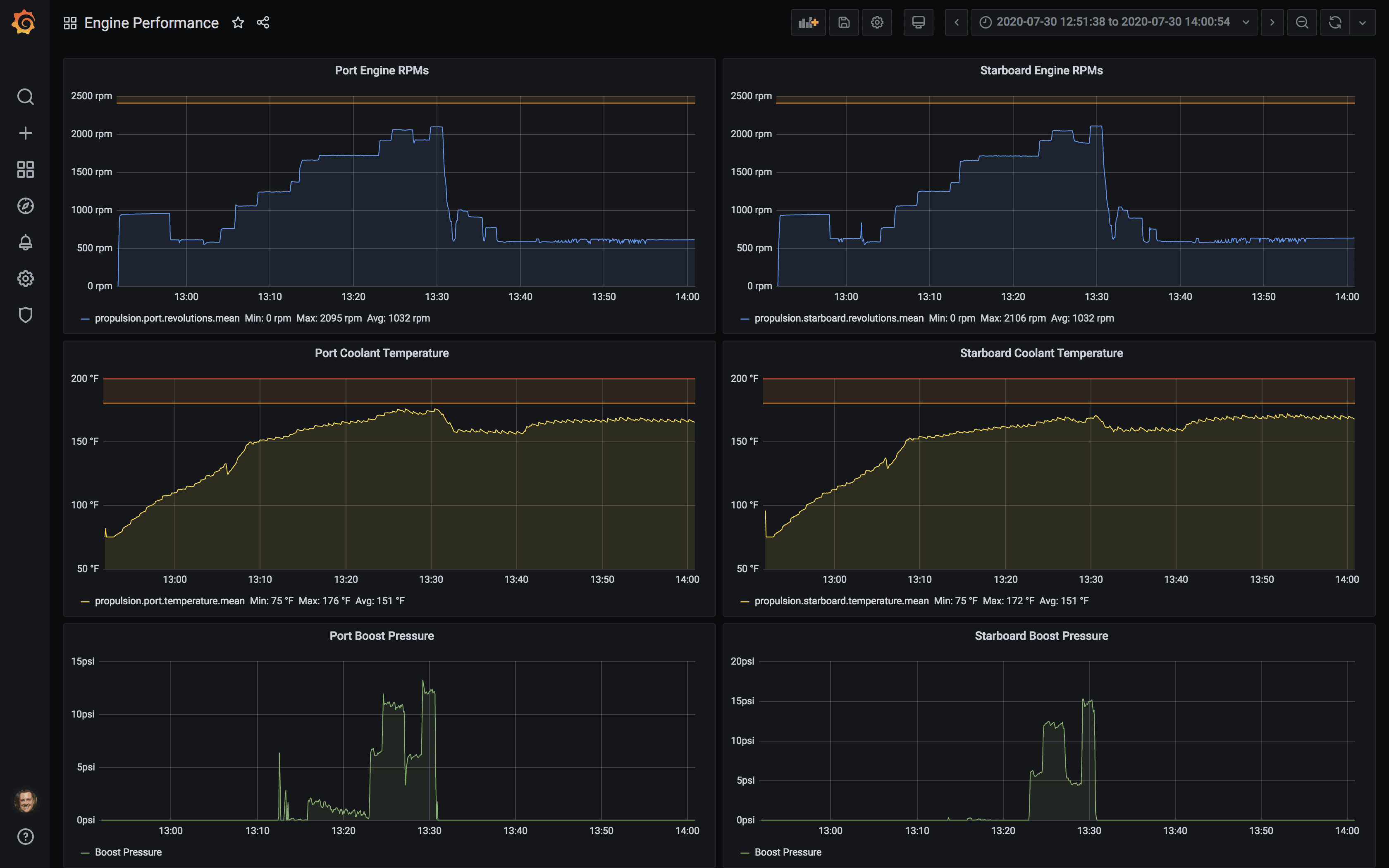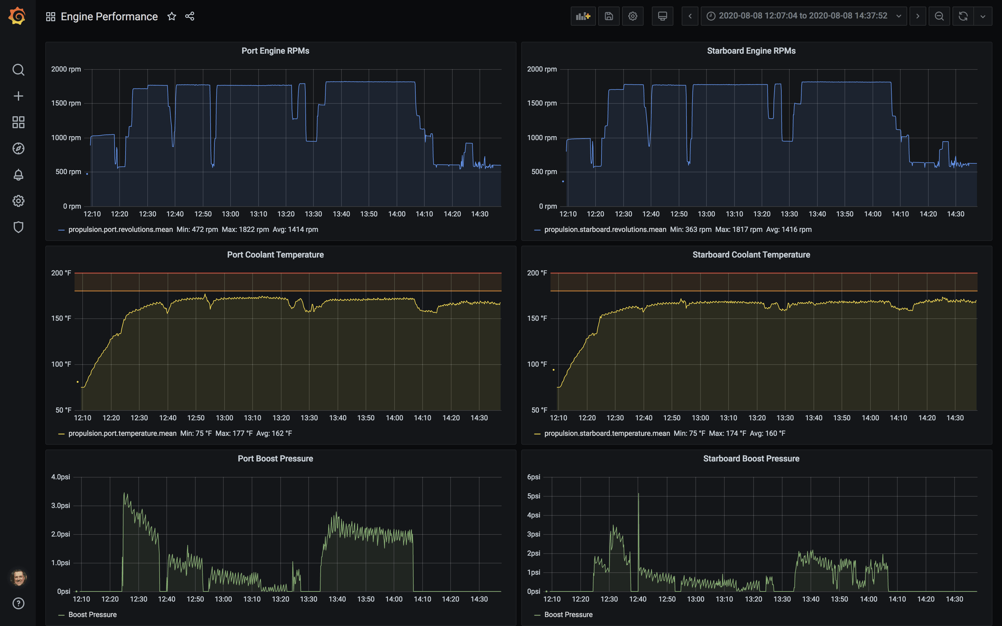 I have discussed my weather dashboard before in Real-time weather from the boat, but I have always wanted more visibility into other areas. I have a couple of new dashboards for engine performance and the electrical system which are detailed below.