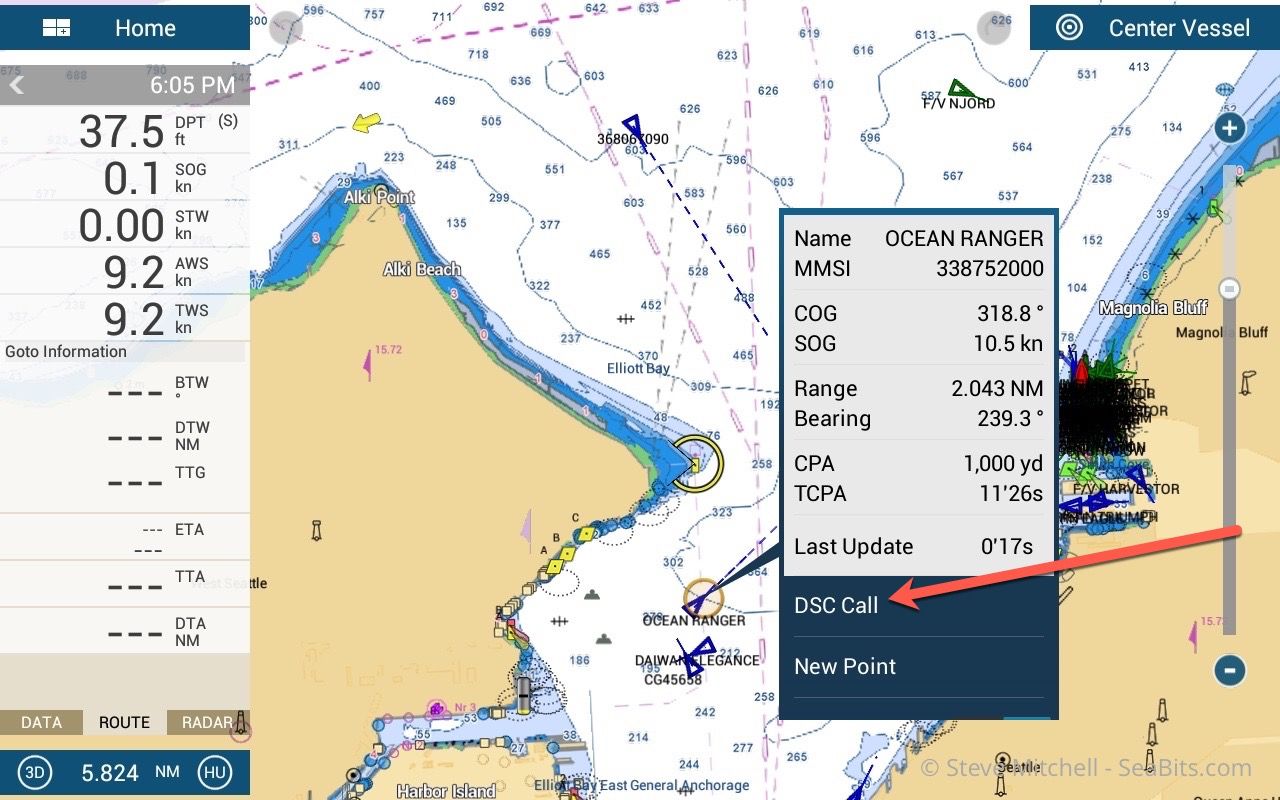 In the screen shot above, you can see that clicking on an AIS target has a new menu item right at the top of the list – DSC Call. Clicking this immediately sends the info to the radio, where you can hit OK and initiate a call. I like that there is a pause so you can fumble around for the mic and get ready to stay something meaningful.