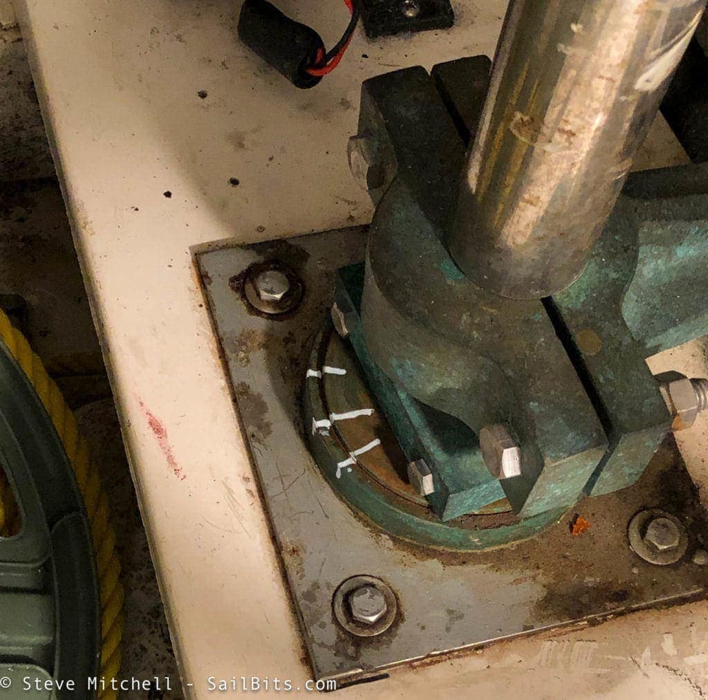 I also took the time before removing my old autopilot and rudder reference unit to mark both rudder posts so I knew where rudder center was. I used my trusty Sharpie white oil paint markers, which I use for all sorts of things around the boat. This would help me when installing the new autopilot and rudder reference unit.
