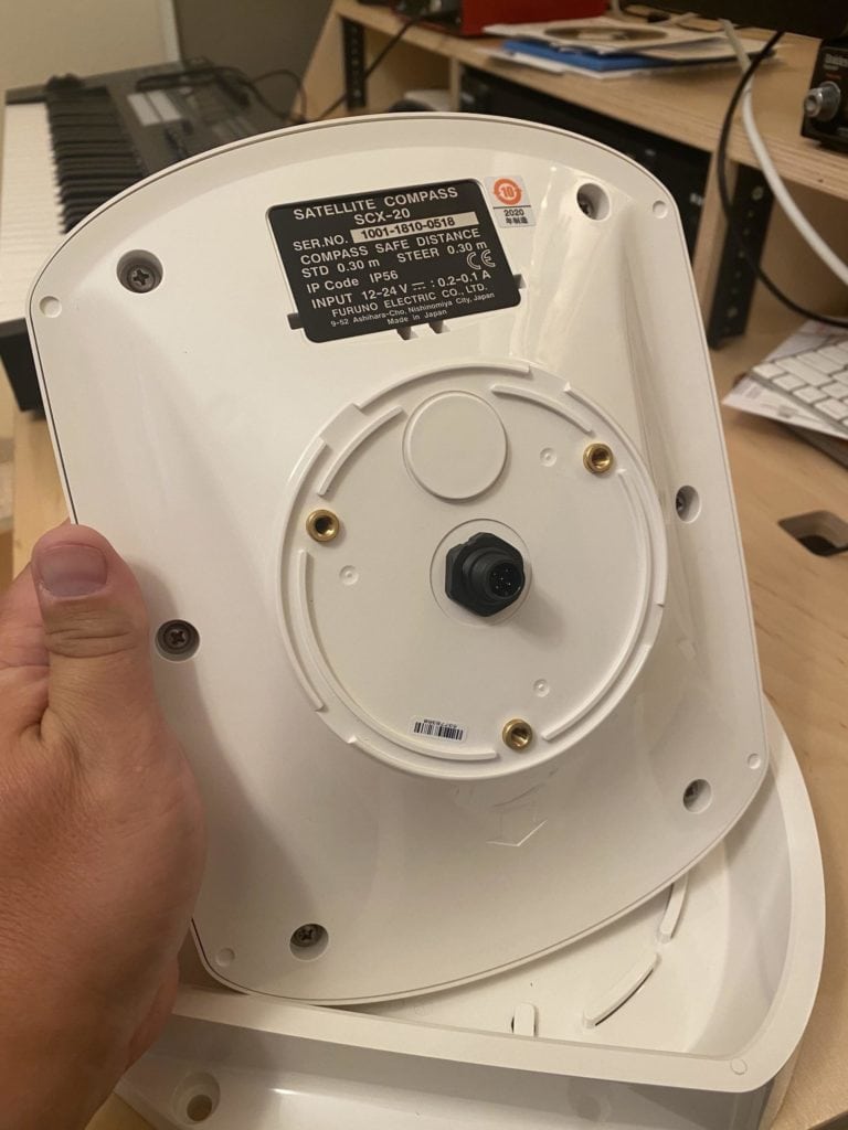 The bottom of this part has an info sticker, an arrow showing which way to orient the compass, the NMEA 2000 connector and connection points for the screws that attach it to the mounting base.