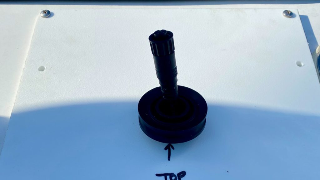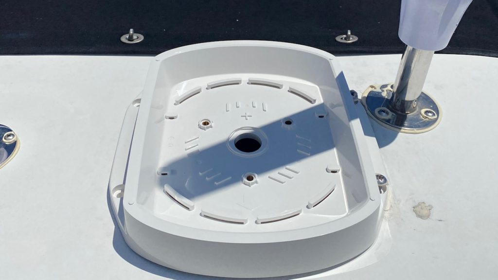 It was super bright out while I was installing things, so the pictures didn’t turn out as well as I’d hoped… What you can see above is the NMEA 2000 cable and rubber washer that goes between the bottom of the mounting bracket and the surface you’re mounting it on. I added a piece of starboard in my installation because the surface underneath had holes from previous old devices that I removed, and I wanted a water-tight seal around everything.