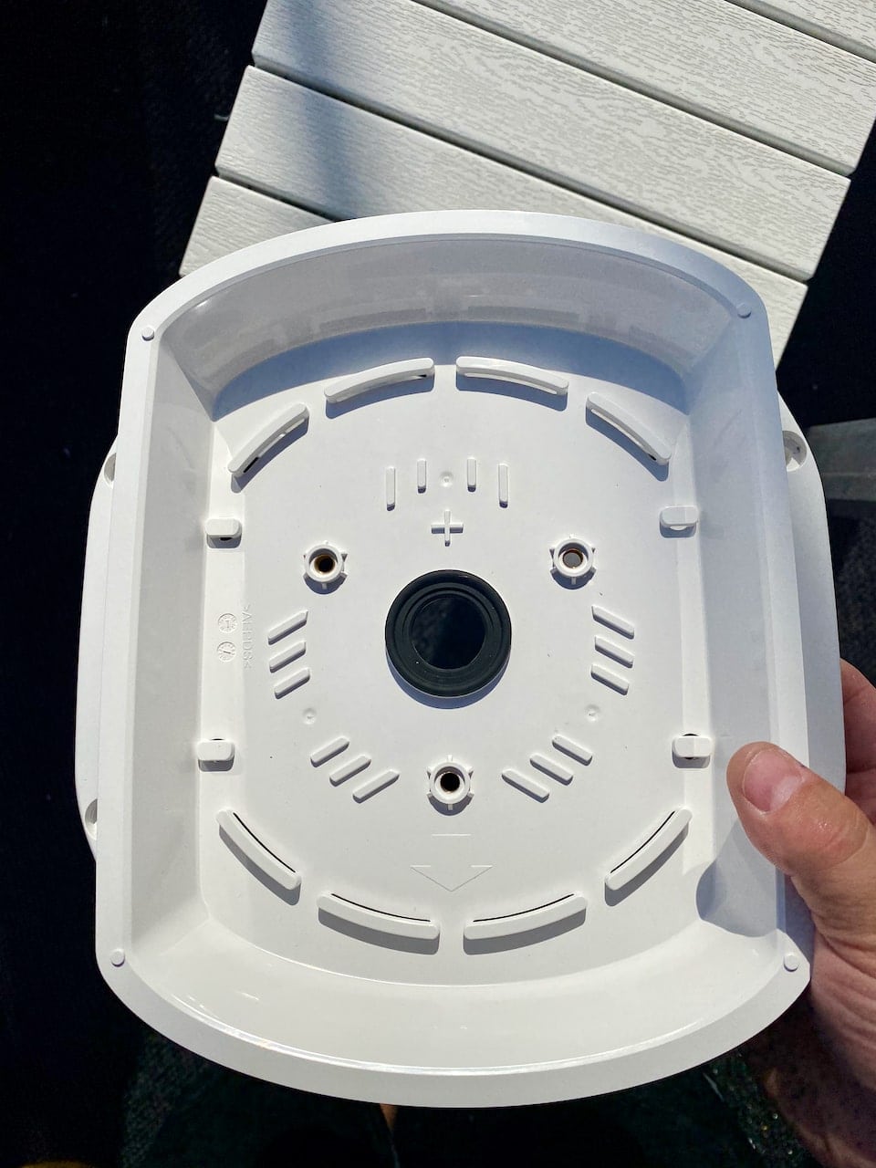 The mounting base itself has matching holes for the screws to hold the compass in the base, a hole for the NMEA 2000 cable, vents for heat dissipation, and markings to show which way things should be oriented.