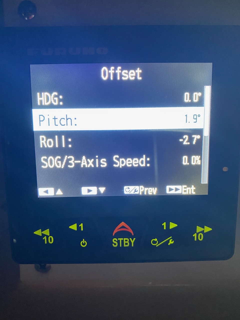 One thing you have to spend some time tuning is any offsets or corrections based on where the unit is mounted. I thought my arch was almost perfectly flat, but it actually curves just a little bit, which I noticed during install. Once I was done with the install, I filled up all my fuel and water tanks, and stood in the middle of the boat. I was tied up at a dock on a calm day, and saw that in particular, the unit was off to the starboard by about 2.7 degrees.