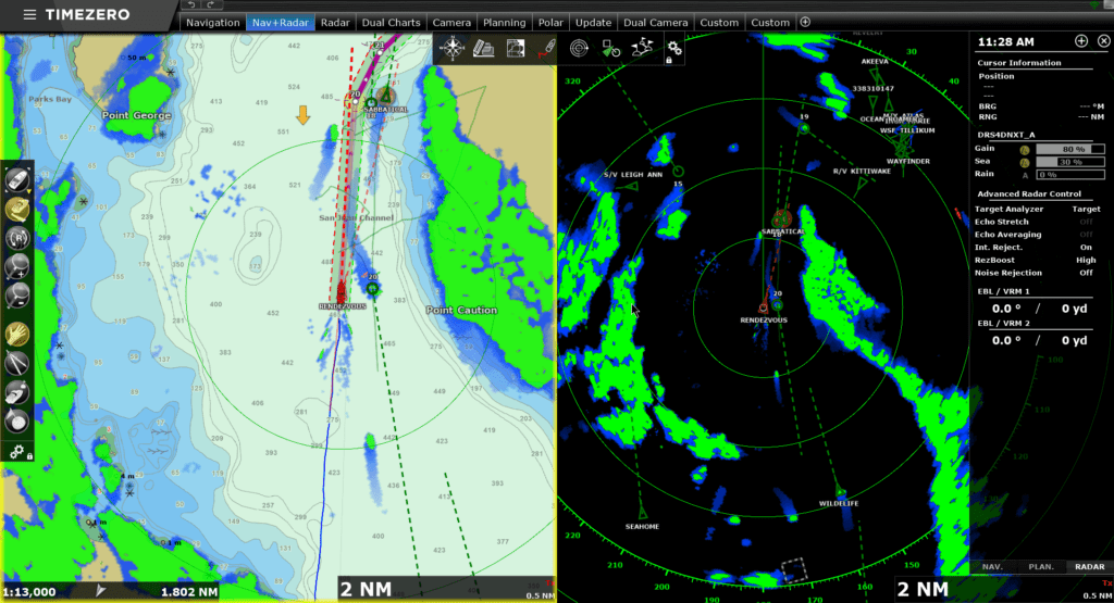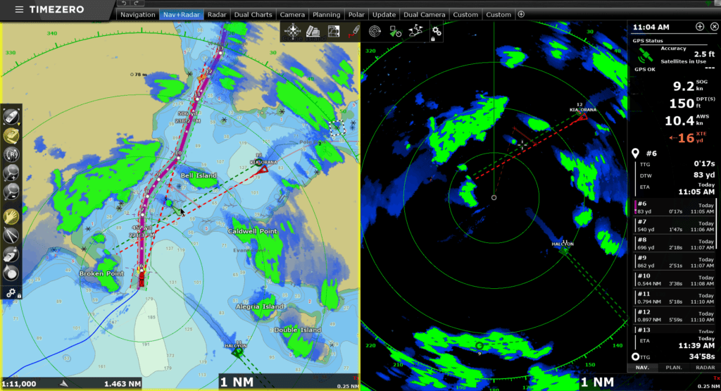 Here’s a final example showing longer trails for boats coming towards me and going away, some even on the right hand radar image that aren’t shown on the chart image, and really consistent trails and shorelines. The boat coming towards me even deviated their course to avoid a collision, and you can see that in the trail.