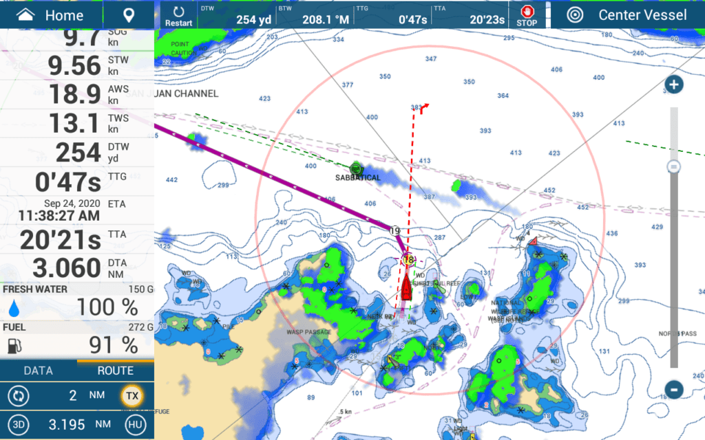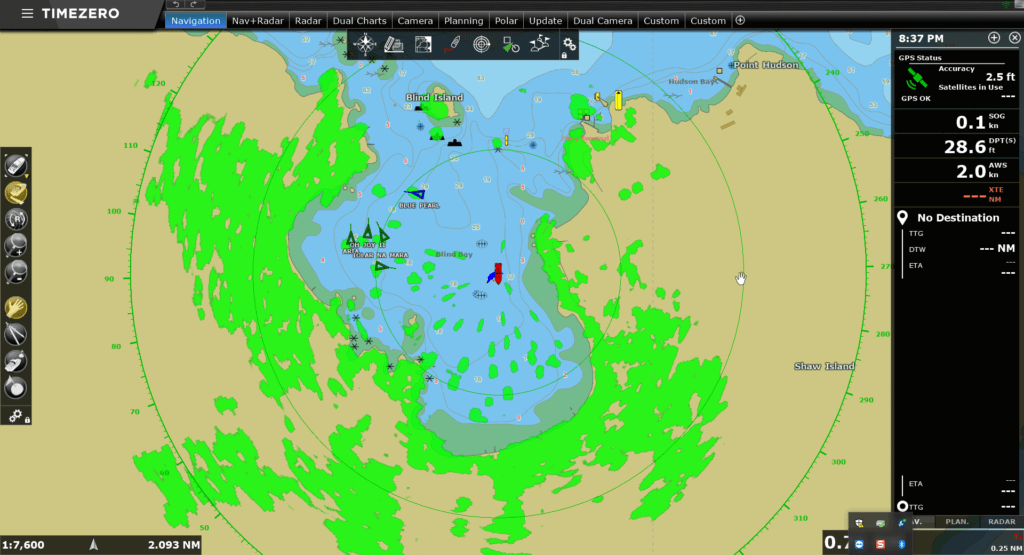 Second, and more importantly, targets are tracked very consistently and show up without variations or wiggles, which I saw frequently before. In the example above, you can see two targets with trails turned on, and how consistent and straight the trails are. This is a craggy, rocky, narrow passage through the Wasp Islands in the San Juan Islands, and the shoreline did not get blurry or messy while I was moving and turning, and the targets were very clear.