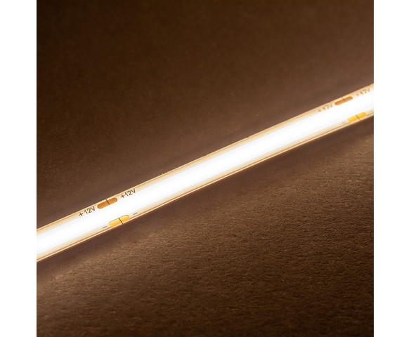 I found a new style of LED called "chip on board" or COB. This design results in a strip light that has a consistent, unbroken bar of light lasting the whole length of the strip. They are very similar to the RGBW strips in that they can be flexed a lot, stuck down with adhesive that is included on the back of the light strip, and cut to length. They also only require 2 wires, of which you can streamline with barrel connectors.
