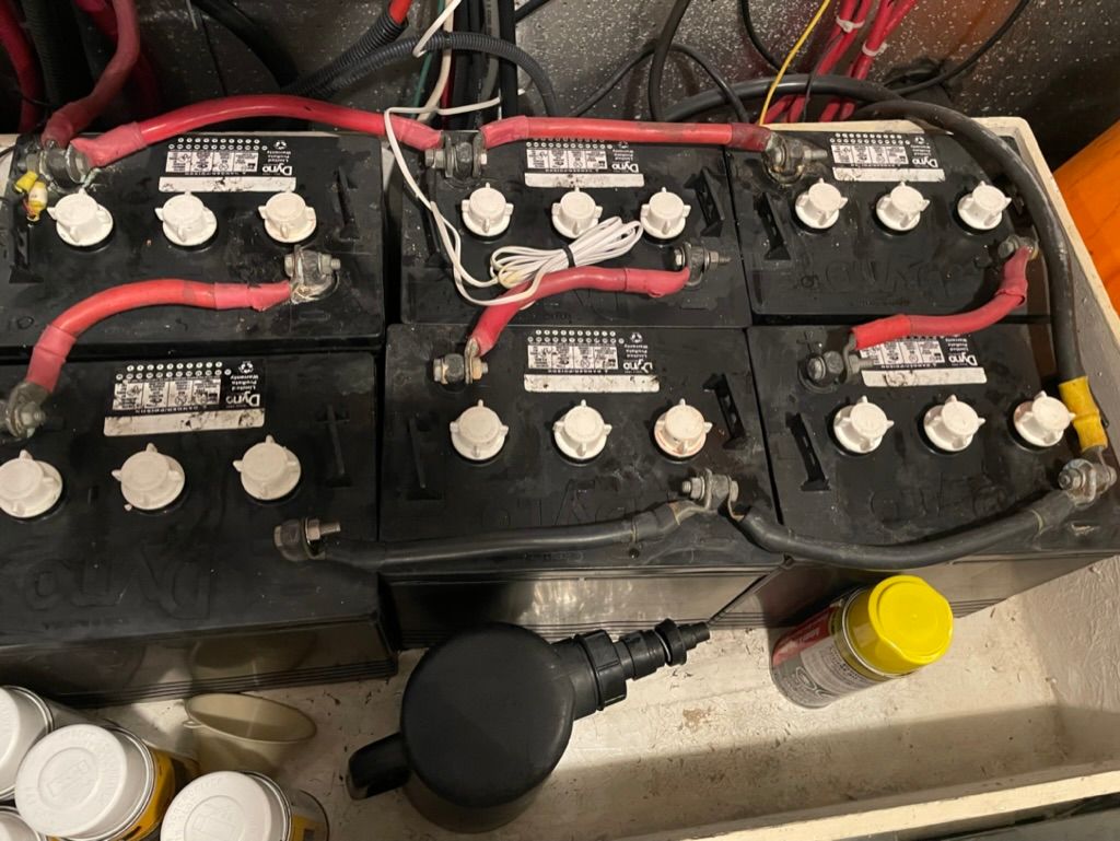 There was a house bank and an inverter bank, both using the same style of GC2 6 volt flooded batteries. The house bank was 6x of these located in the engine room, and were responsible for all DC 12 volt loads - lights, pumps, instruments, and also some heavy loads including the windlass and dinghy davit. The inverter bank was in the lazarette and consisted of 8x of the same GC2 6 volt batteries connected directly to a Magnum MS2812 inverter that powered all outlets throughout the boat, the refrigerator, and the microwave.