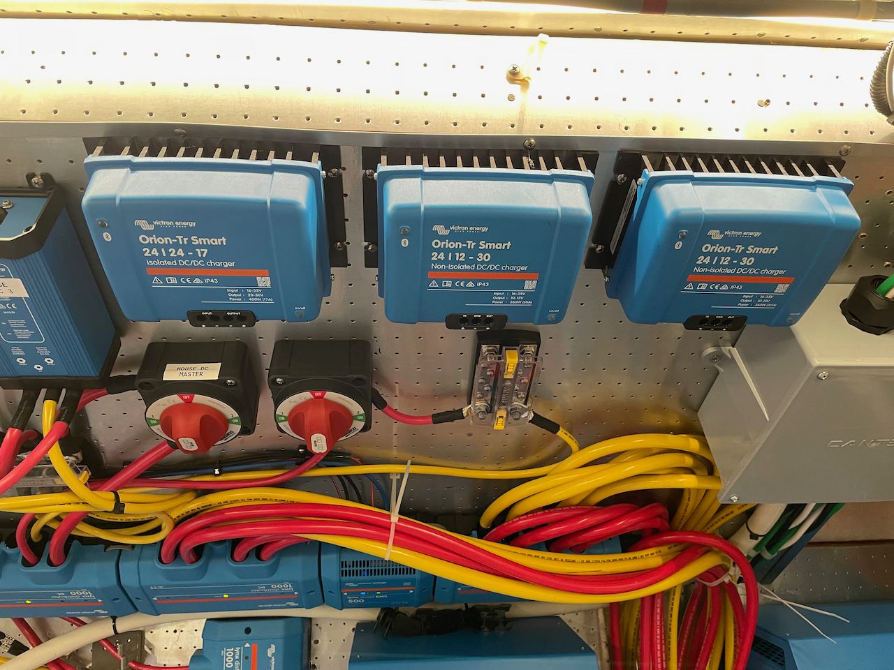 The entire DC system on Kaos is 12 volts, and I was not replacing or upgrading that as part of this project. I tried a number of different combinations of things over a 2 month period, and ended up settling on 3x Victron Orion DC-DC power supplies that convert 24 volts to 12 volts, and are each capable of 70 amps. That gives me a total of 210 amps of 12 volt power, which is more than double what I calculated my max usage was. It also provides some redundancy since I have 3 units in case of a failure.