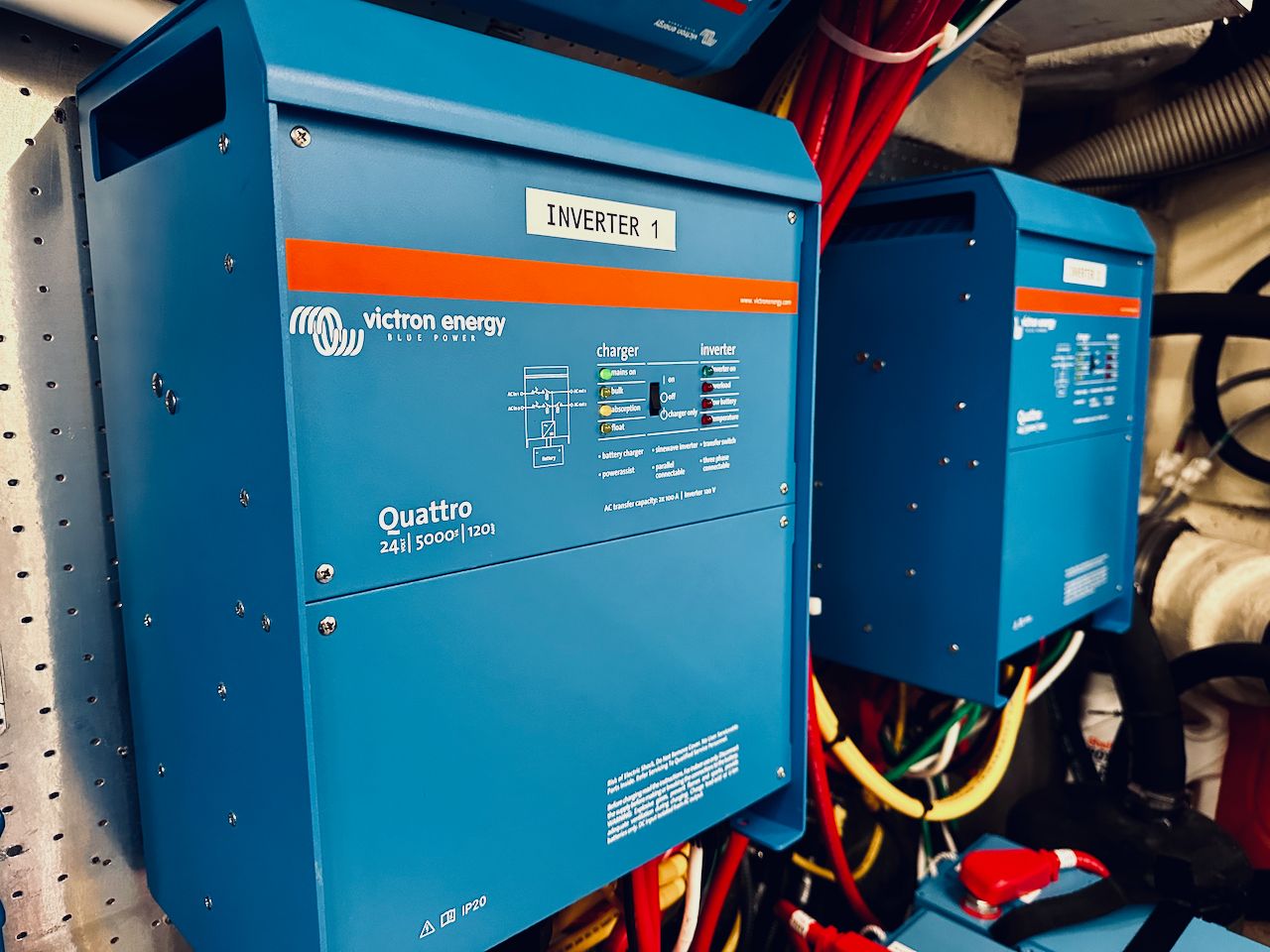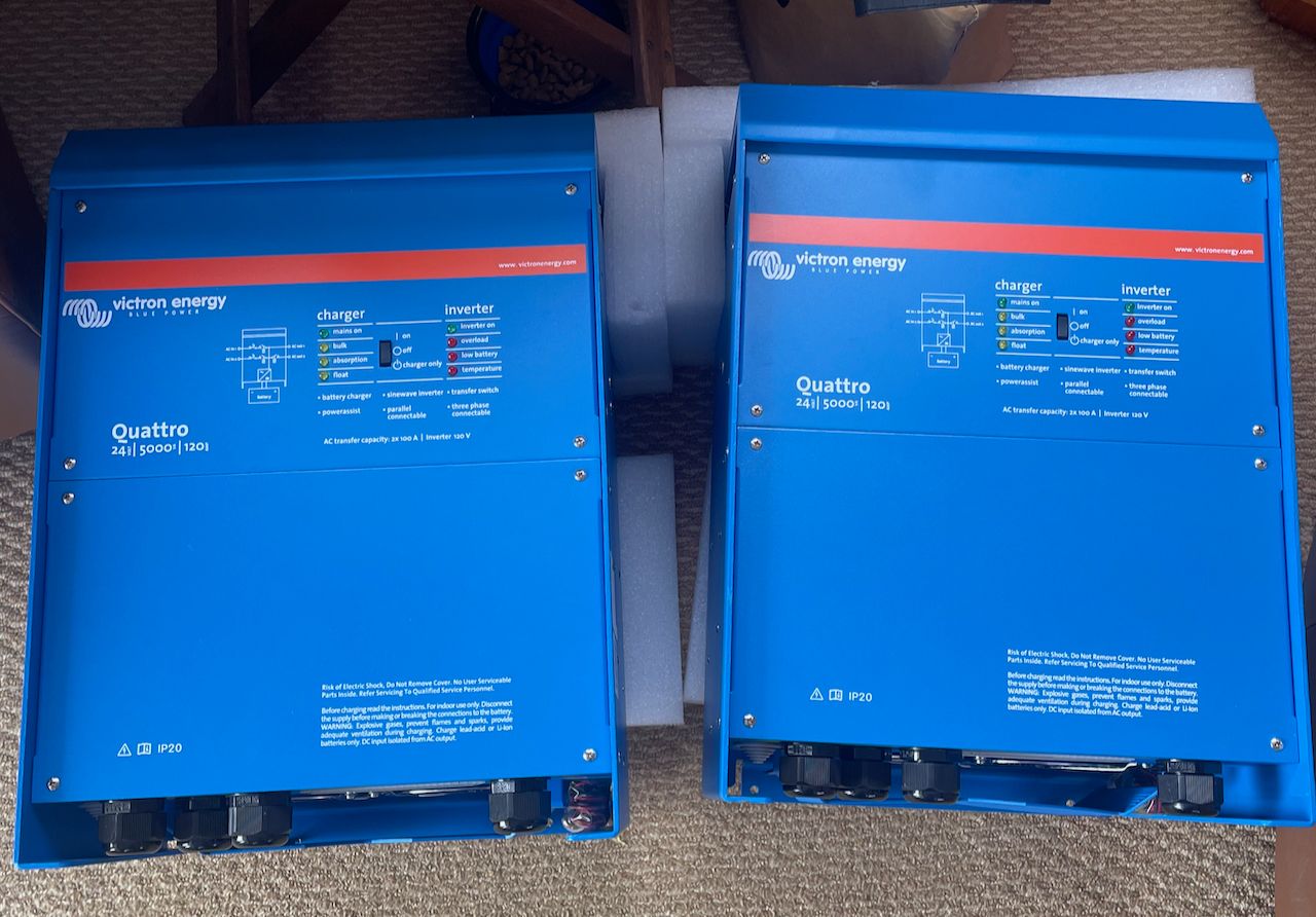 - 24 volt Victron Quattro 5000W 120V AC inverter - max charge per unit - 120 amps. 2x units = 240 amps.