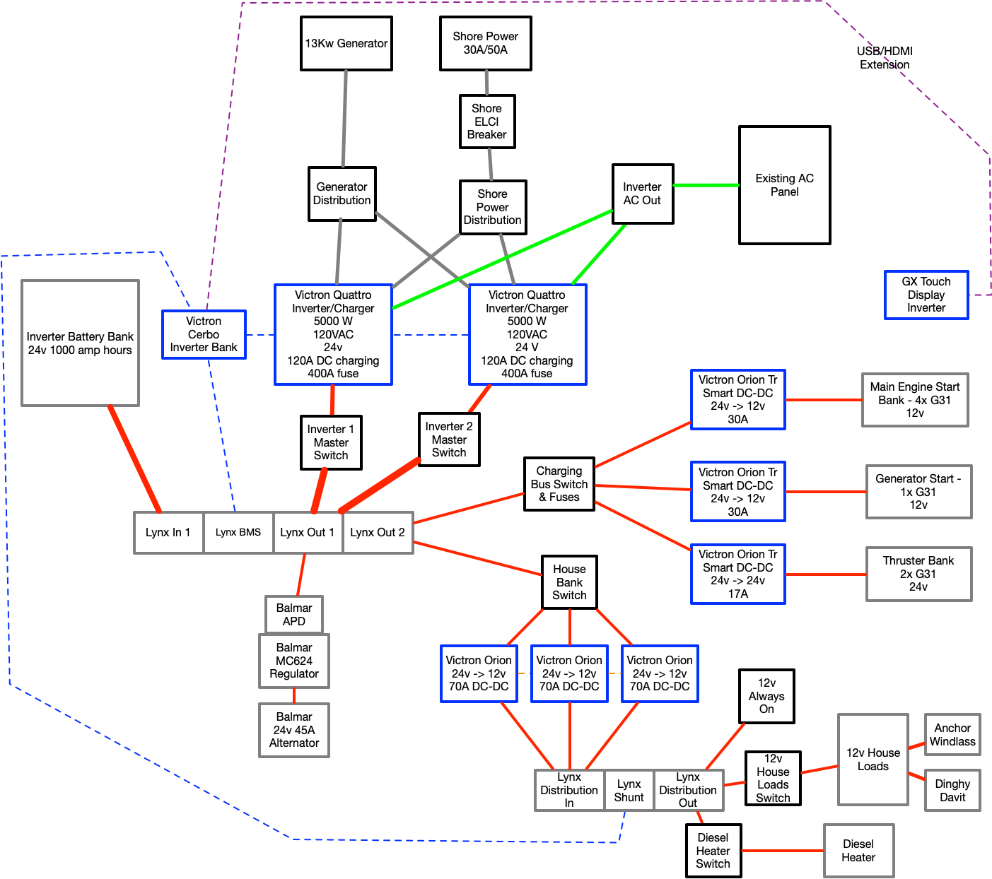 The one challenge is the 12 volt anchor windlass where in some situations, it draws an enormous amount when it is heavily loaded and causes a voltage sag. This causes some sensitive things to restart. The eventual plan is to upgrade the anchor windlass motor to 24 volt and connect it to the existing 24 volt thruster bank.
