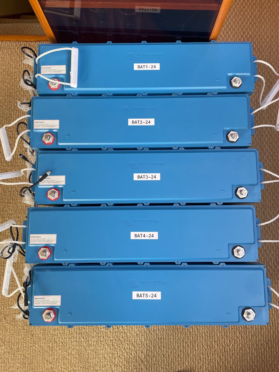 I was able to install the new batteries in the engine room in roughly the same space as the original 6x GC2 batteries, although oriented slightly a different way. That replaces the 6x GC2 house bank and the 8x GC2 batteries in the lazarette that were used by the old inverter.
