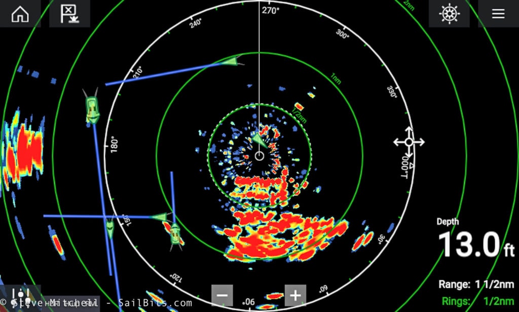 Here’s all of those features enabled at once. You can see AIS ships, blue lines indicating their projected path, and radar echoes and trails under some of the ships as well.