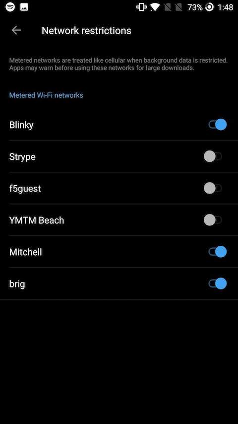 You’ll see a list of WiFi networks, and a toggle to turn on those that you want to limit bandwidth on. Apps should tell you when they are going to do something big, and the Android operating system also reduces what it does in the background.