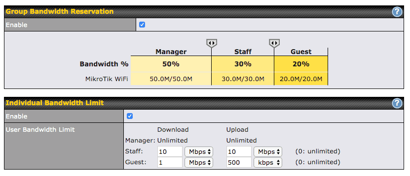 The Manager and Staff devices can use the majority of the bandwidth, while the Guest devices have a policy setup to only allow 1Mbps download and 500Kbps upload. In addition, if the Manager or Staff devices need more bandwidth, the Guest stuff is slowed down even more.
