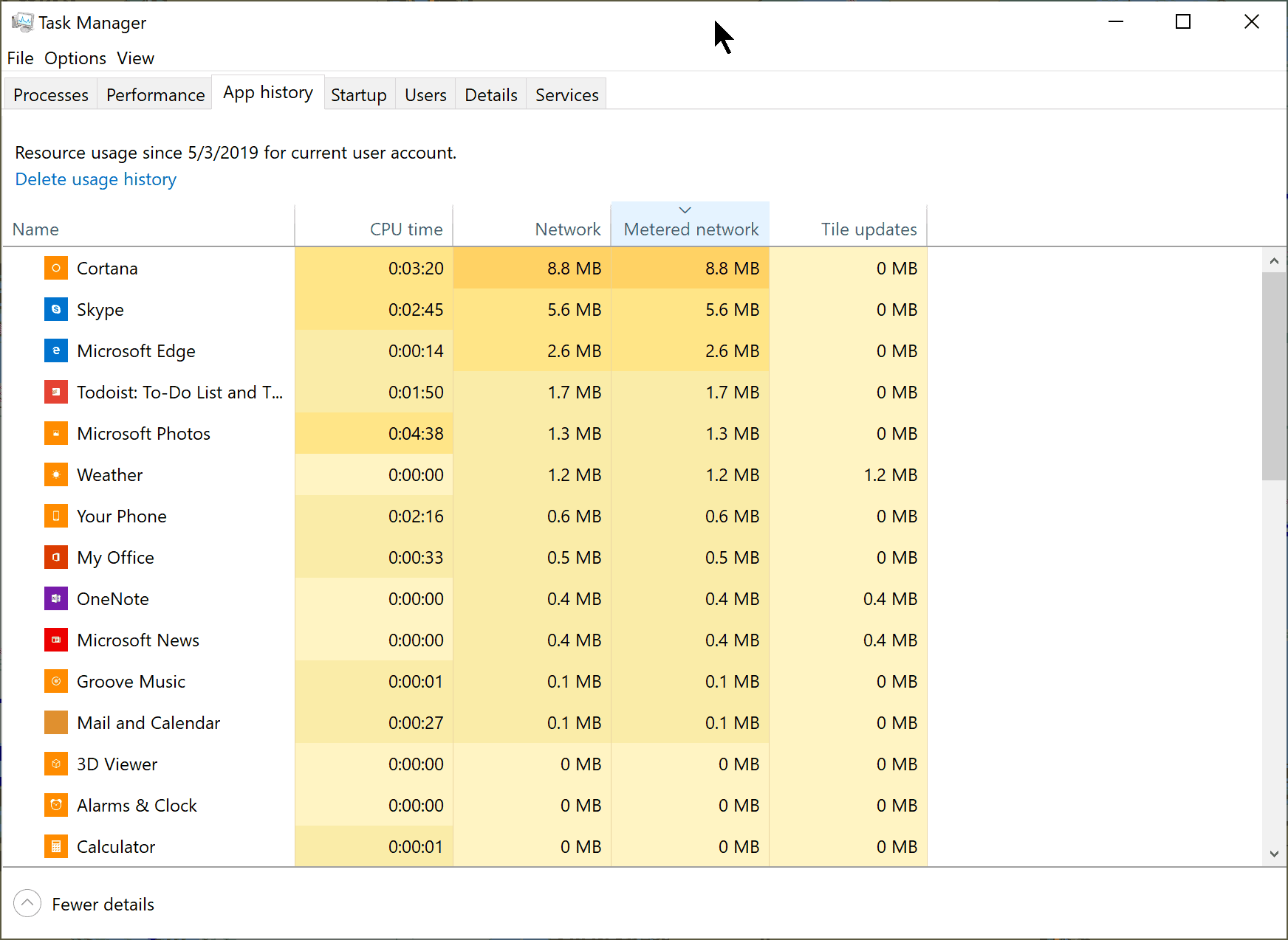 The final spot in Task Manager is App history, and will show how much data has been used per app on various networks, including normal network (the Network column) and Metered networks. This is more useful over longer periods of time, and not necessarily to troubleshoot a real time issue.