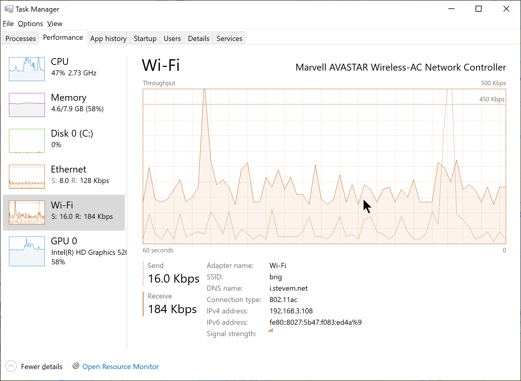 The easiest one to see if your Windows machine is going crazy is the Performance tab in Task Manager. Here you can see CPU, memory, disk but also the individual network adapters. In my case above, the WiFi network is the one connected to the internet, and we can see a decent amount of traffic coming and going.