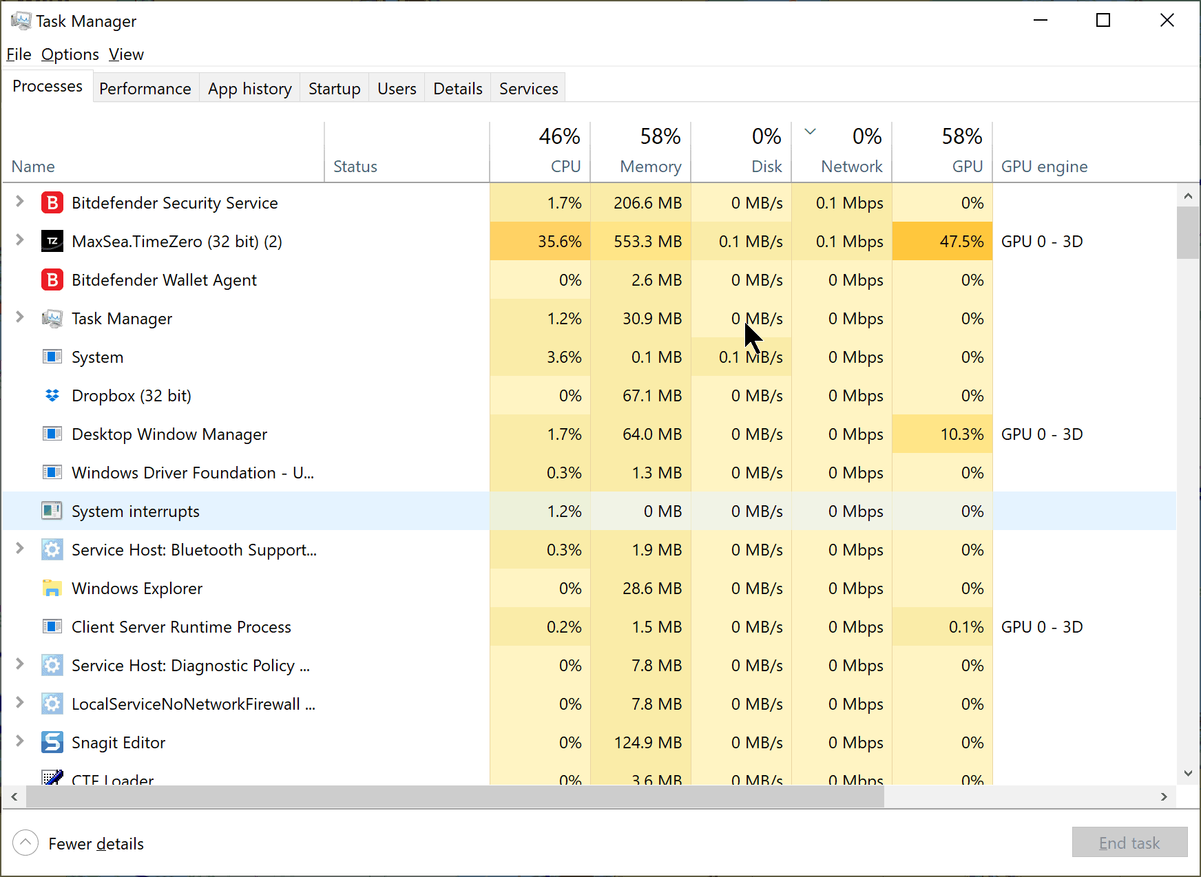 You can also see how much each app is using on the network on the Processes tab. Just click on the “Network” tab to sort by that one instead of the default of CPU. In this case, my antivirus is using a decent amount of bandwidth, and TimeZero is as well, although the latter is likely out my ethernet link to the Furuno equipment, and not internet based.