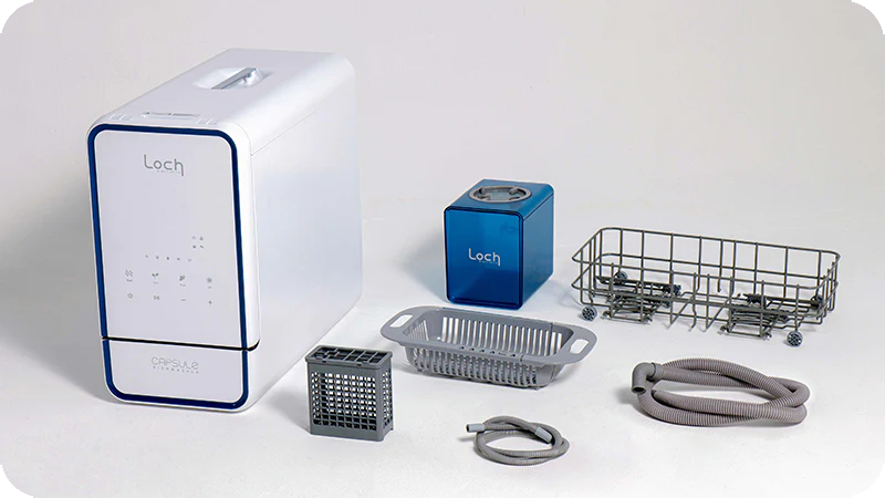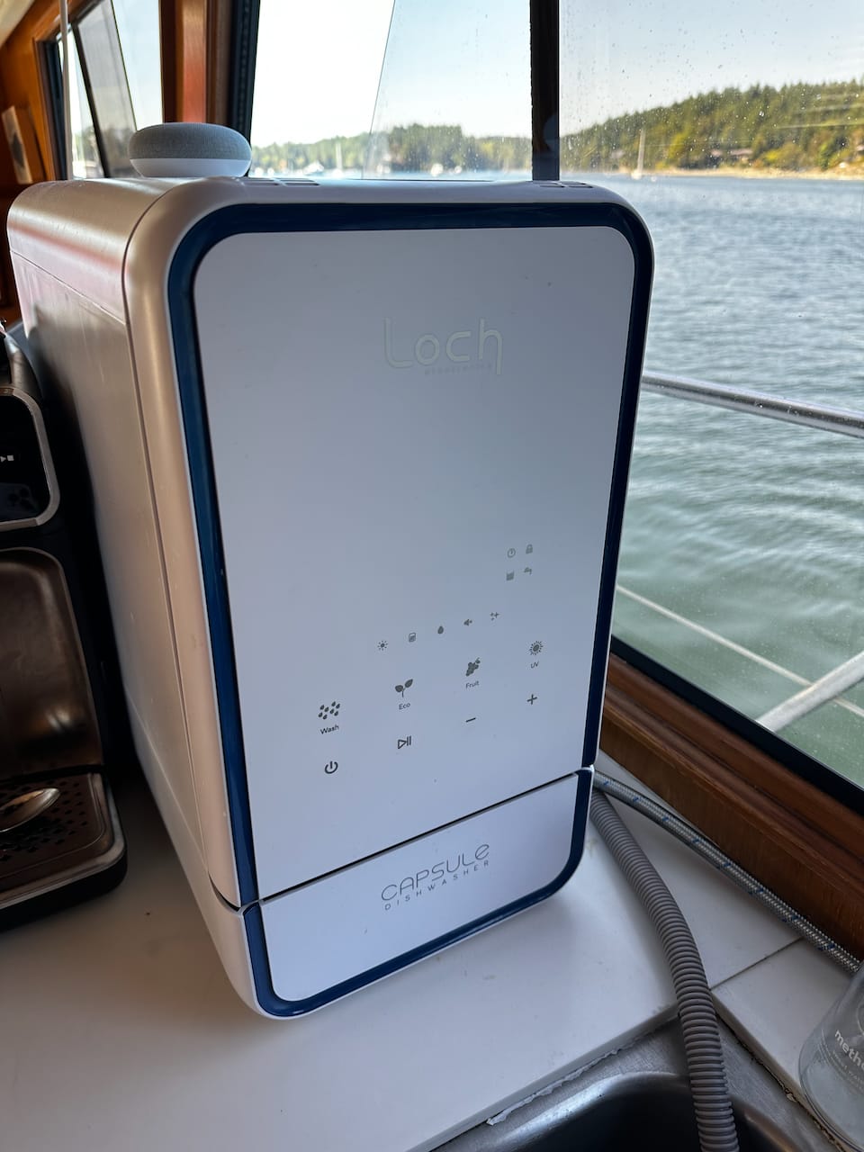 The Loch Capsule is a bit different in a couple of ways. First, it is taller and allows for standard dishes to fit into it without tipping them on the side. Second, it uses a lot less water and power for a standard wash, which is good on a boat.