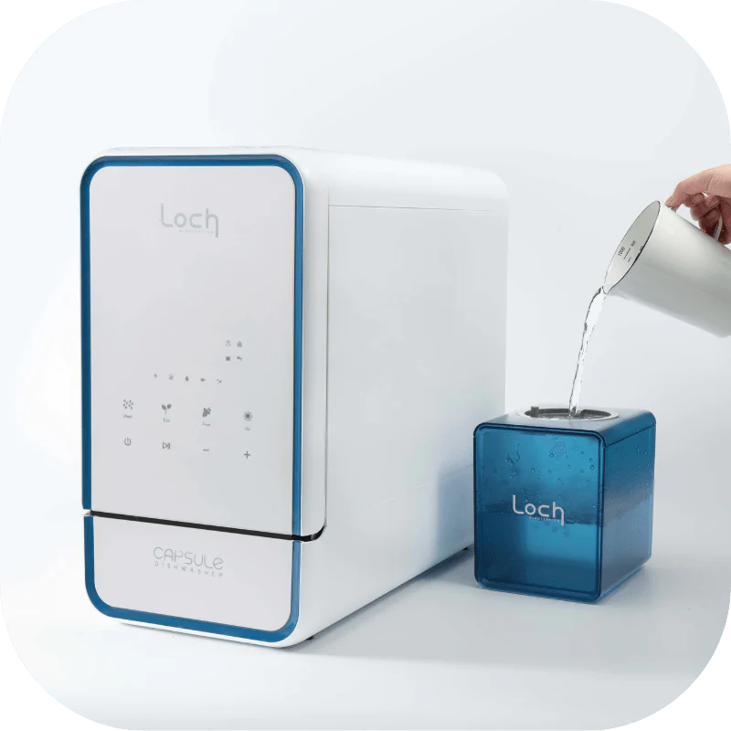 The Loch Capsule is a bit different in a couple of ways. First, it is taller and allows for standard dishes to fit into it without tipping them on the side. Second, it uses a lot less water and power for a standard wash, which is good on a boat.