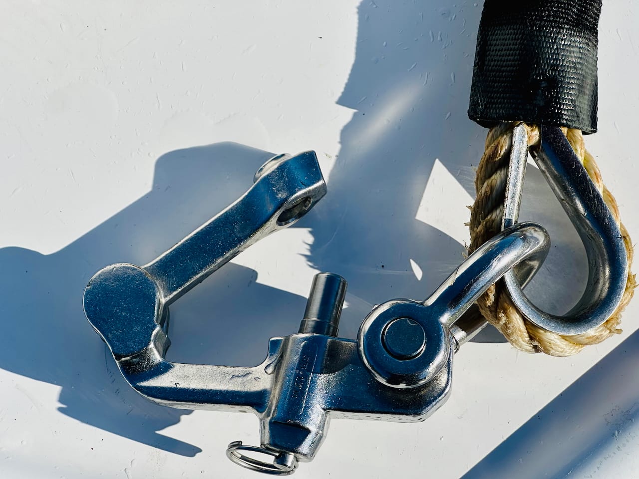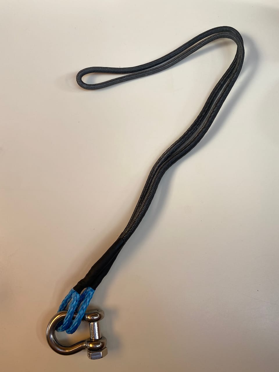The forward end of the nylon, with a blue soft shackle attaching to the strop: