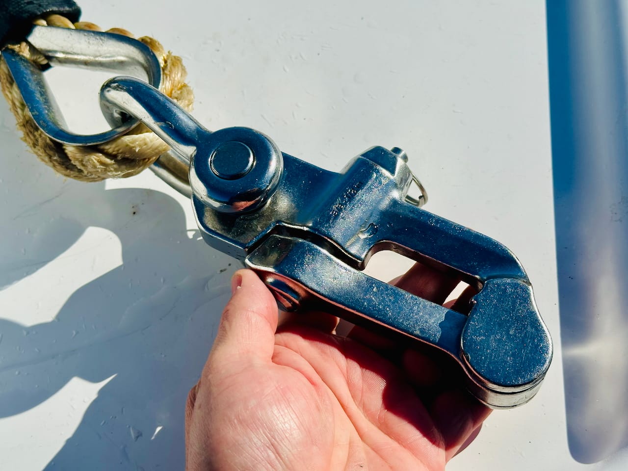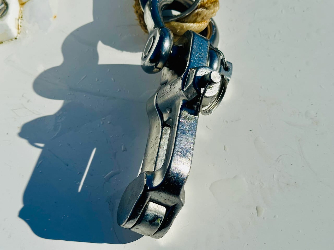 We keep a close eye on the soft shackle for wear, and I make a new one every year, even though we’ve never noted any real wear in the Dyneema. In fact, the only real wear I’ve seen has been on the nylon piece, which was rubbing on one of the turning blocks and got replaced last year. Yes, I have pictures