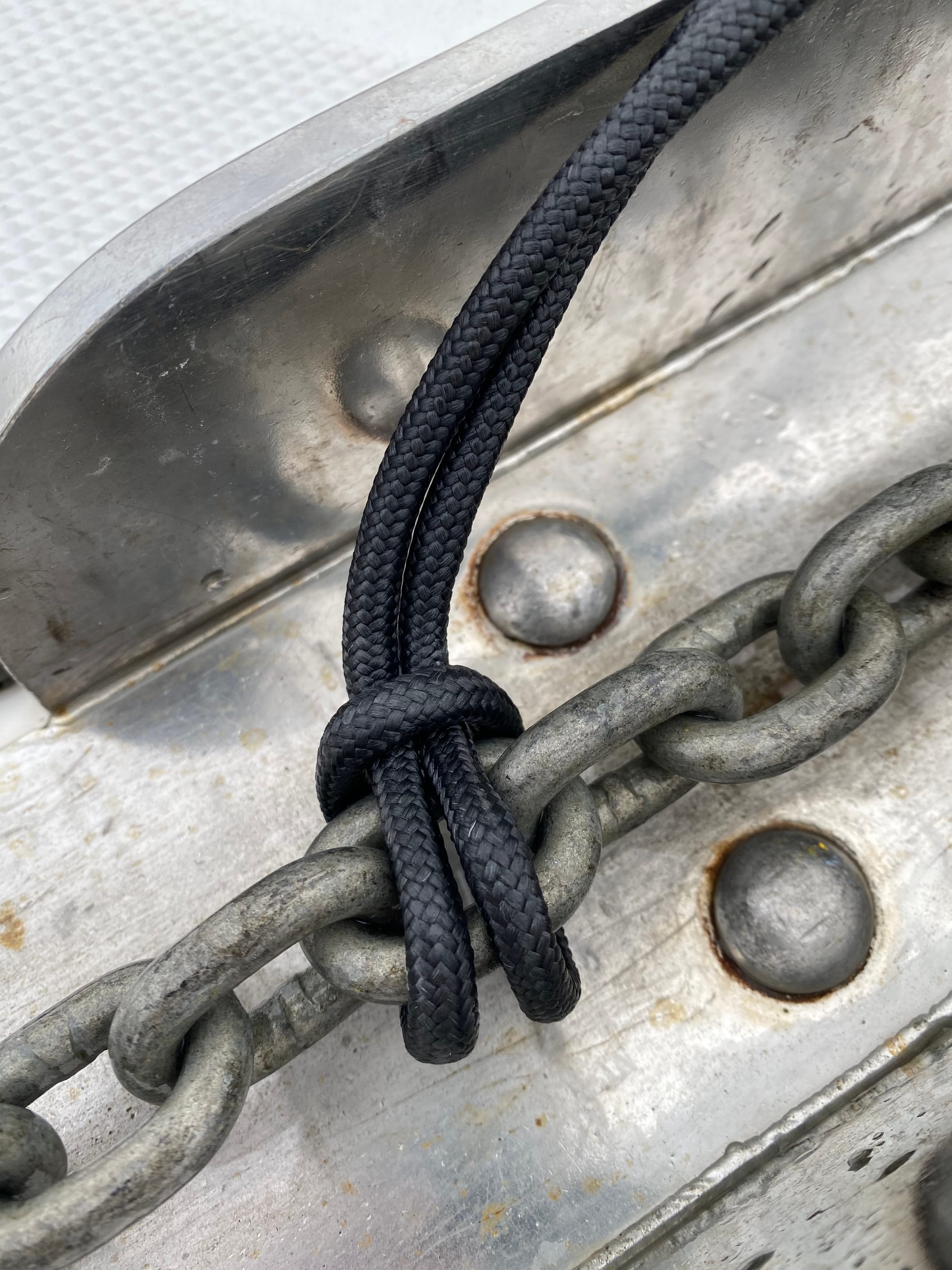 But a few years ago, after reading some online opinions, we’ve shifted to an on-deck snubber - about 25’ of 5/8" nylon - fastened back aft, runs along the inside of the toerail (with several aluminum "rappel rings"keeping it out from underfoot. Up forward we have a 9’ dyneema strop (eye at both ends), which runs through a low-friction ring thence over the offside bow roller. We attach it to the chain using a soft shackle arrangement (not a true soft shackle - two separate pieces - one loop with a diamond knot, then another loop with the usual soft-shackle “noose” – both of which are cow-hitched to the eye in the end of the strop.